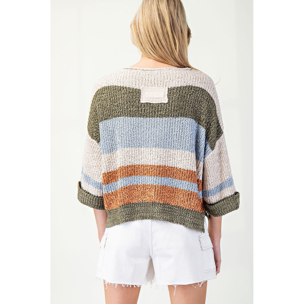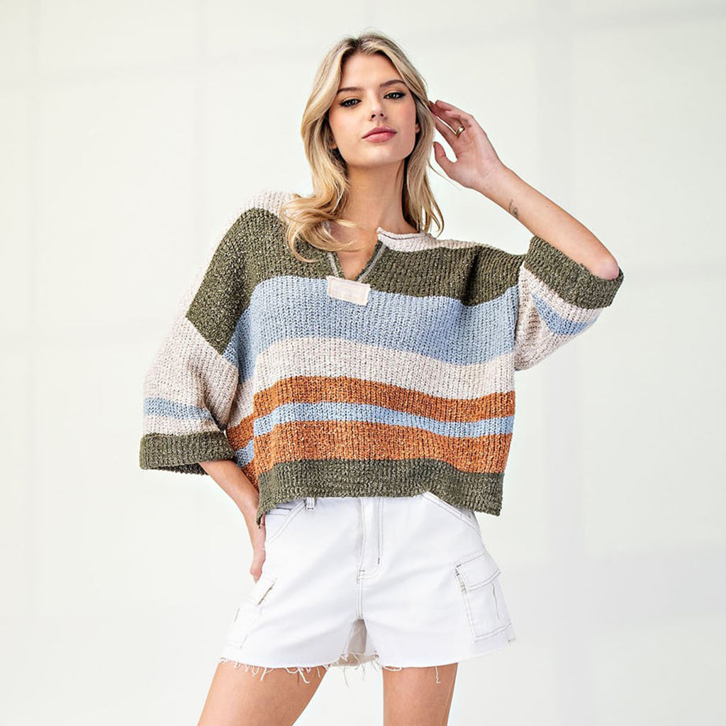 Indulge in luxury with our Fern Striped 3/4 Sleeve Sweater. The intricate design in shades of fern, blue, cream, and rust adds a touch of elegance to this sweater. This textured top is perfect for any season.