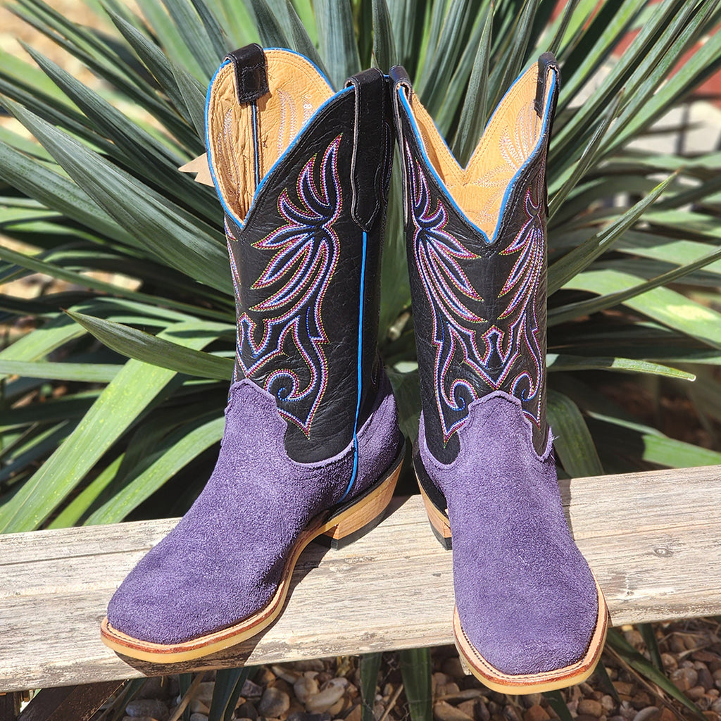 These Fenoglio Boots are perfection! Purple ruff outs with a soft black leather shaft. The colorful stitch pattern is absolutely unique and beautiful! These boots are more than just good looking; they are made to work. The strong leather and oxbow sole, make these boots perfect for those long days in the saddle or on the ranch, yet they are sharp enough to wear as a dress boot if you like. You really can not go wrong with these!