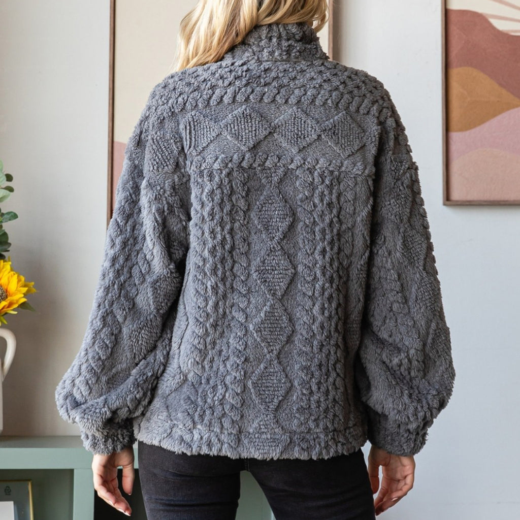 Get cozy with a sweater that's as fun as it is functional. This grey quarter zip sherpa is your new go-to for those moments when you want to feel hugged by your clothes. The plush sherpa fabric is impossibly soft, while the quarter zip lets you adjust your vibe throughout the day—zip up when you need extra warmth, unzip for perfect temperature control.