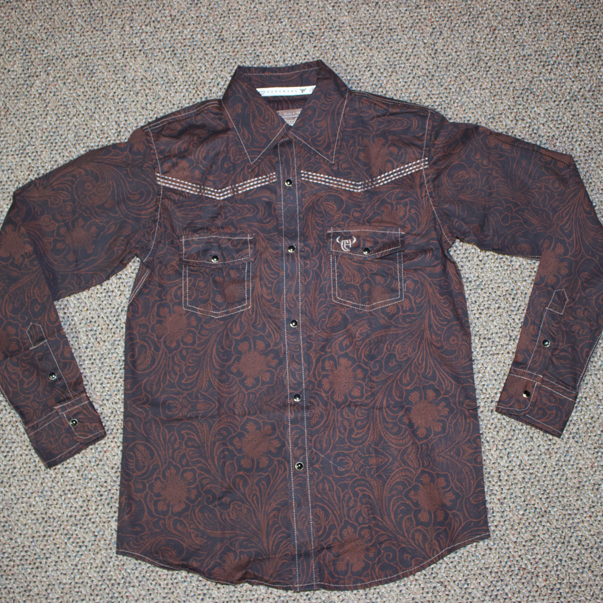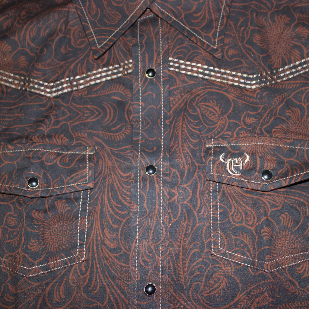 Saddle up, little buckaroo! This brown tooled long sleeve shirt brings authentic Western style to your young cowpoke's wardrobe. Durable and comfortable for all-day wear, this shirt lets kids embrace their inner cowboy with genuine Western flair. Yeehaw!