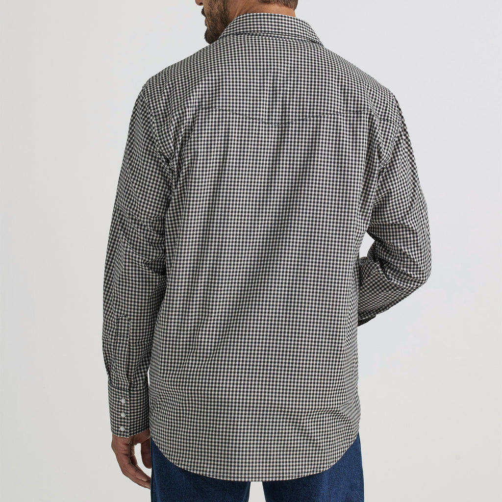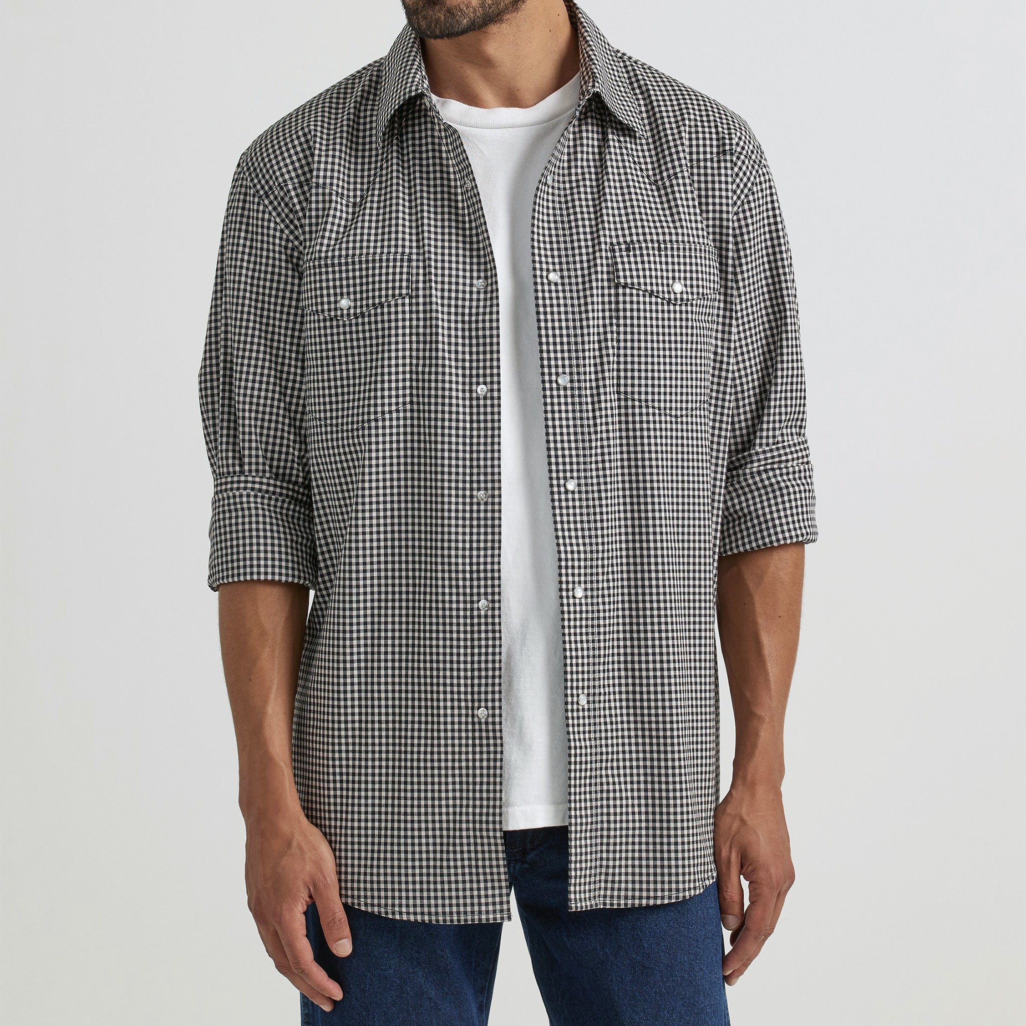 Wrangler is a clear choice for the busy cowboy. This men's long sleeve shirt is made of a comfortable cotton blend with a little bit of stretch, stain release, and a wrinkle-free finish. Wear this wrinkle resist snap shirt with a Wrangler jean for a look that gets you out the door at a moment's notice.