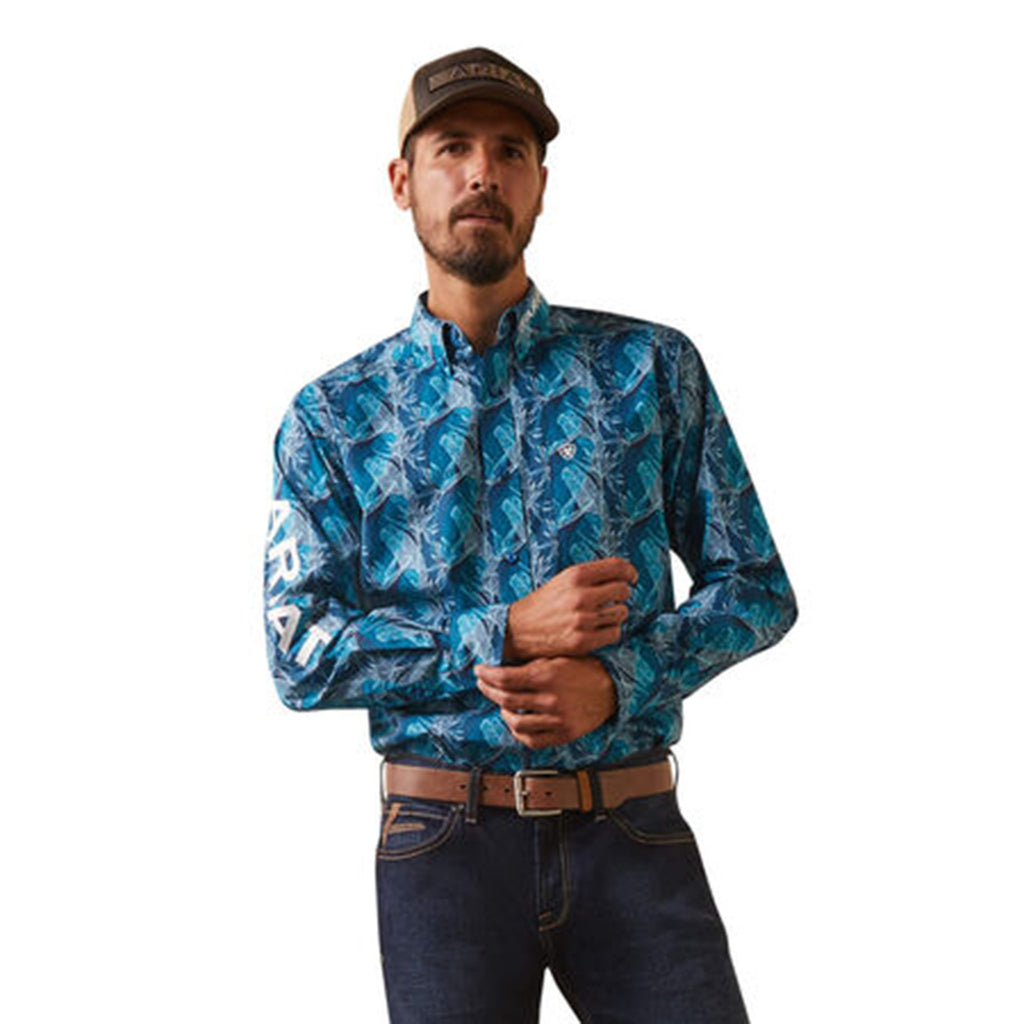 This teal feather print shirt is sure to be an eye-catcher. It features a single open chest pocket, Ariat logo on the sleeve, collar back of shirt and has blue buttons. This is a fitted shirt so it is slim through the waist and chest.