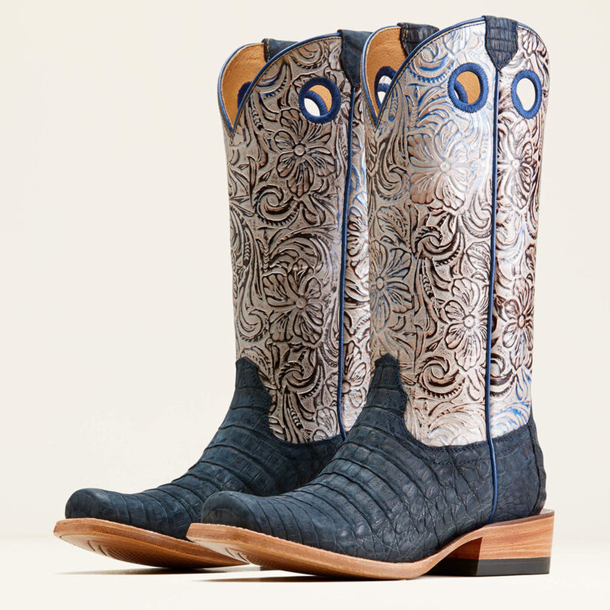 Step into the arena with serious style in these boots. Crafted from genuine caiman leather, these beauties deliver that luxe look with authentic texture and durability that'll turn heads at the barn or beyond. The navy colorway pairs perfectly with everything from jeans to dresses, making them your go-to boot for any occasion. Built with Ariat's signature comfort technology, you'll stay supported through long days of riding, working, or just living your best western life.