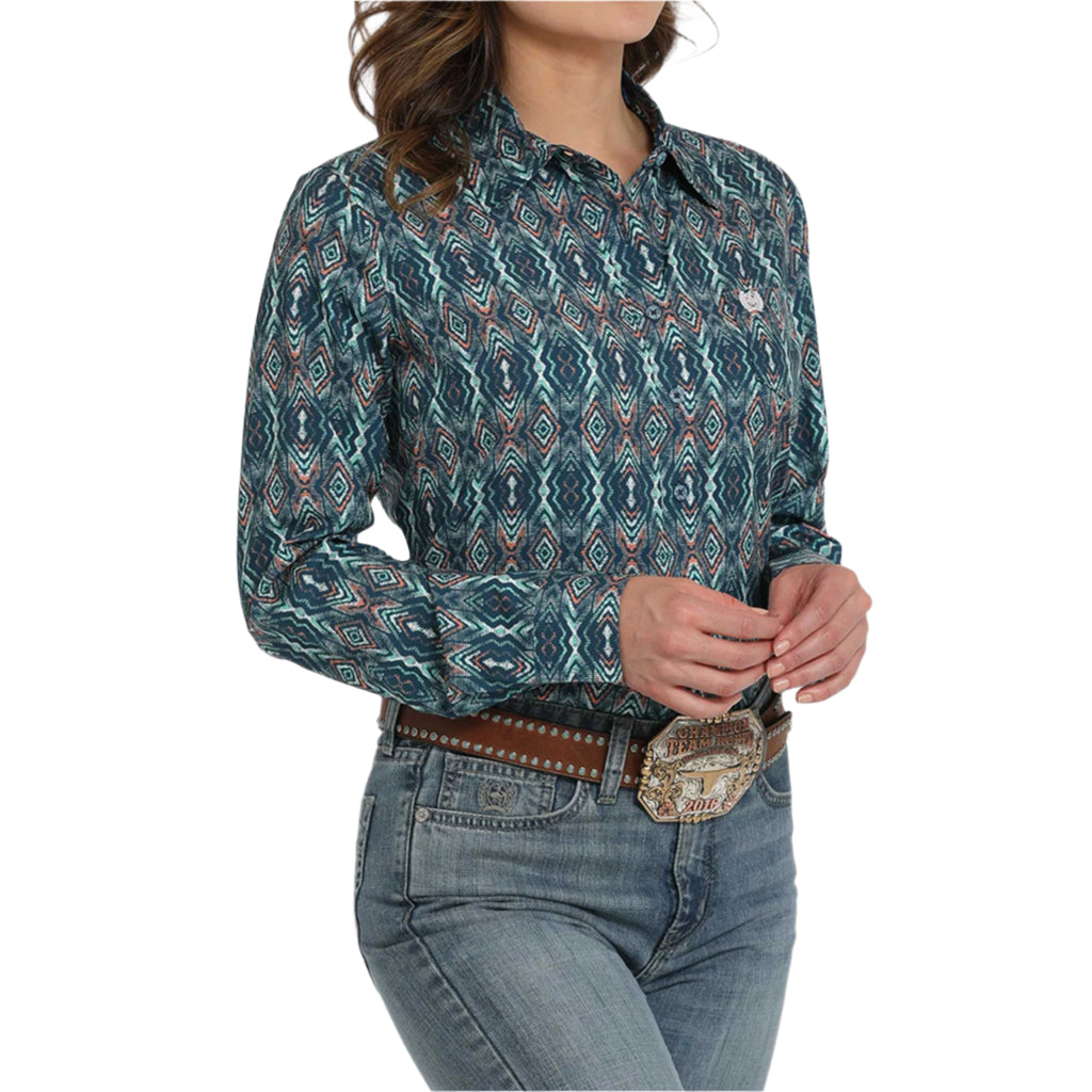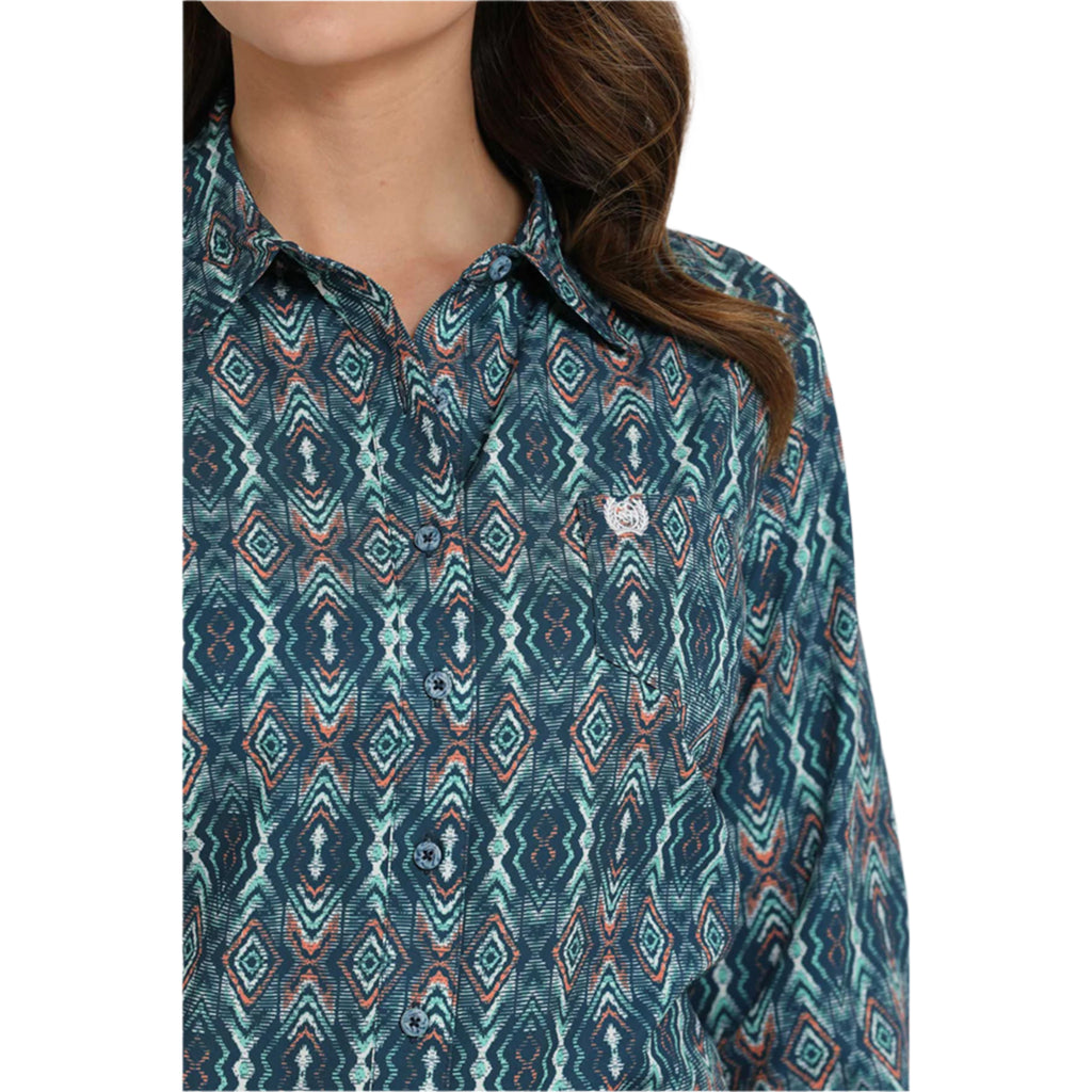 Make a bold statement with the Cinch women's ArenaFlex shirt. Featuring a striking geometric design and flexible, performance-driven fabric, this shirt is built to keep up with your fearless attitude. Whether you're commanding attention at the arena or turning heads on the street, this shirt delivers confidence and style in every move.