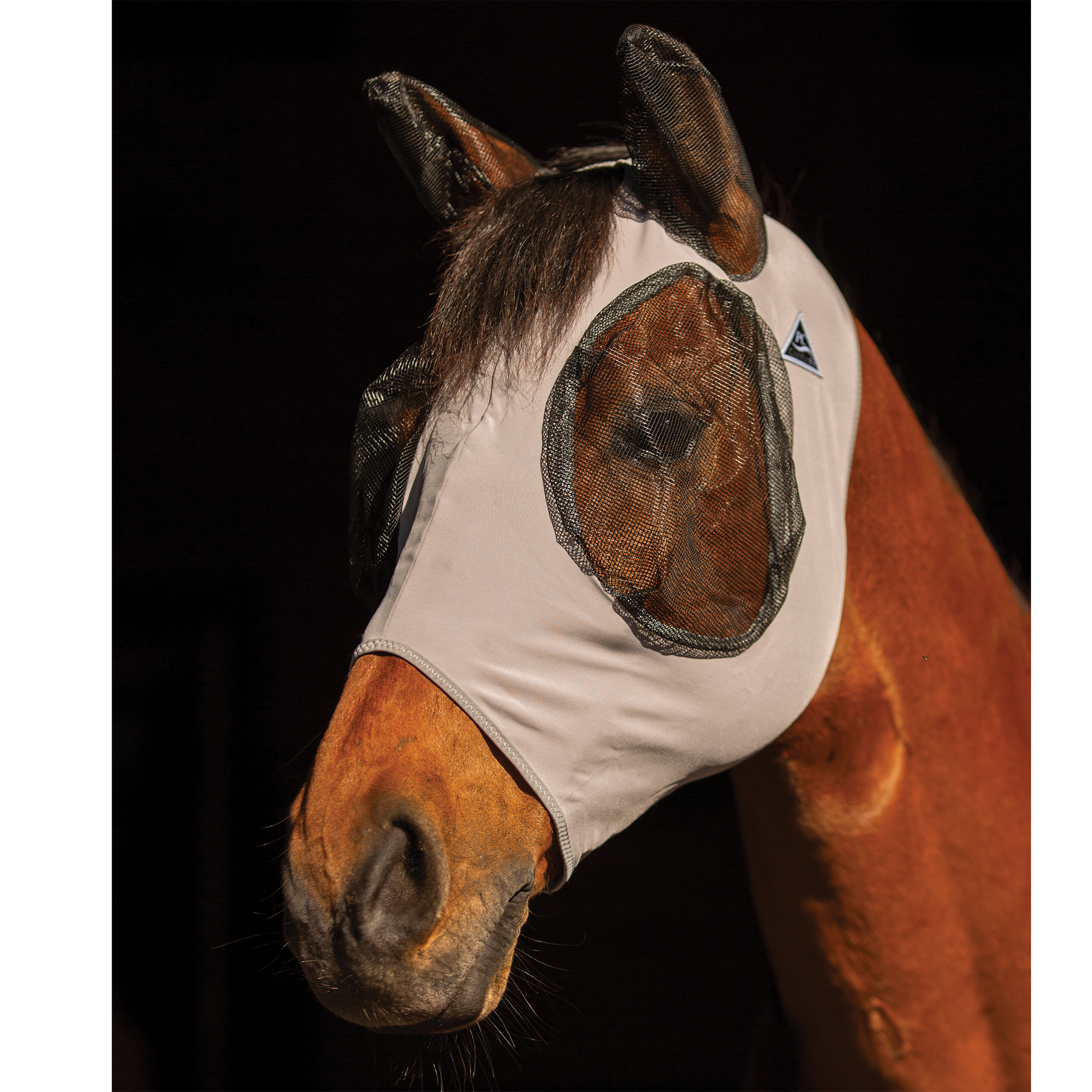 Designed with your horse’s comfort in mind! Smooth, stretchy lycra with binding around the edges fits your horse’s face like a glove. Mesh around the eyes and ears allows for clear vision and keeps flies and bugs away. Forelock opening for improved fit.