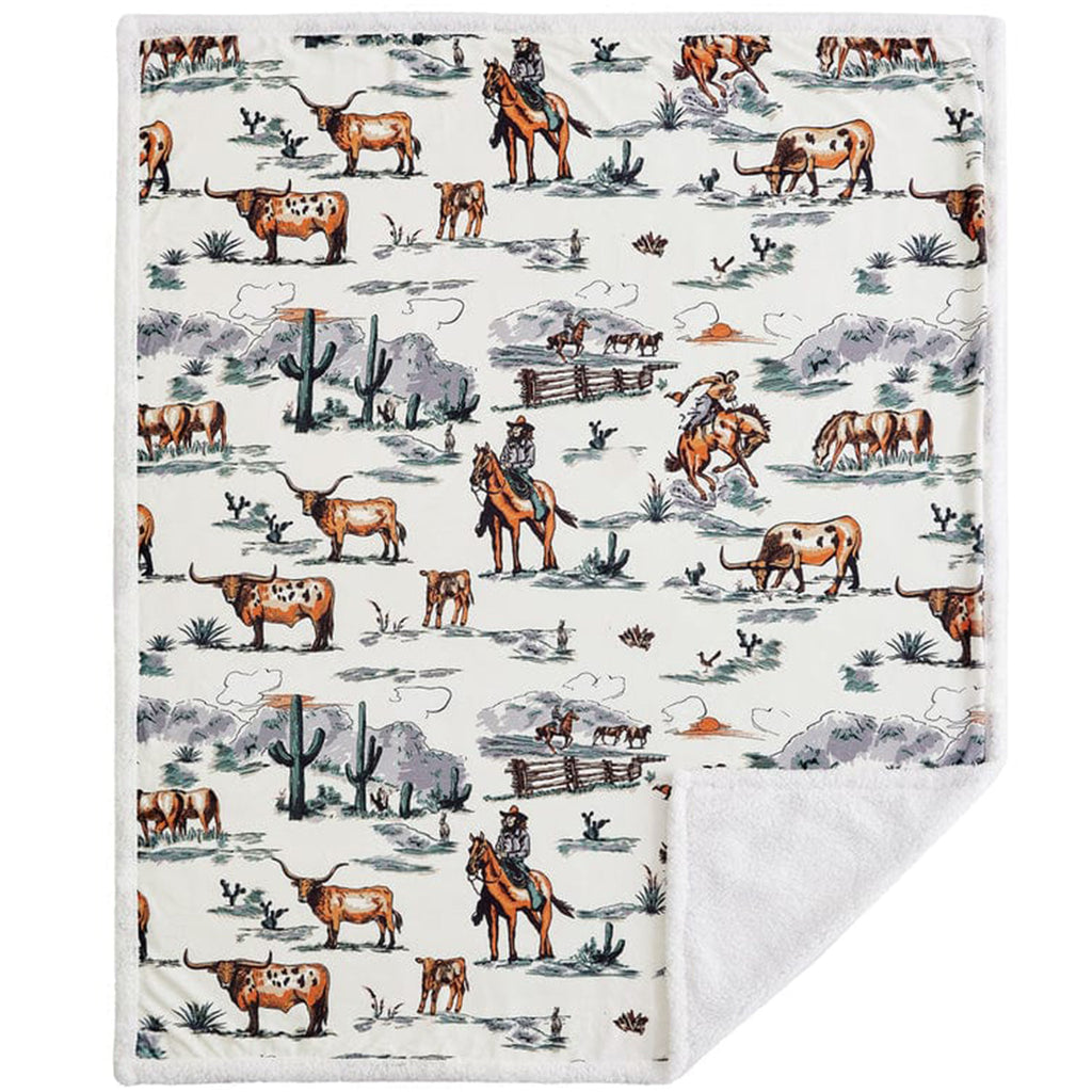 Cozy up your space with this nostalgic Western themed throw blanket. It features a colorful medley of cowboys, rugged terrain, and grazing herds on a cream background. The reverse side is made from fluffy sherpa fleece- to keep you comfy on those chilly days.