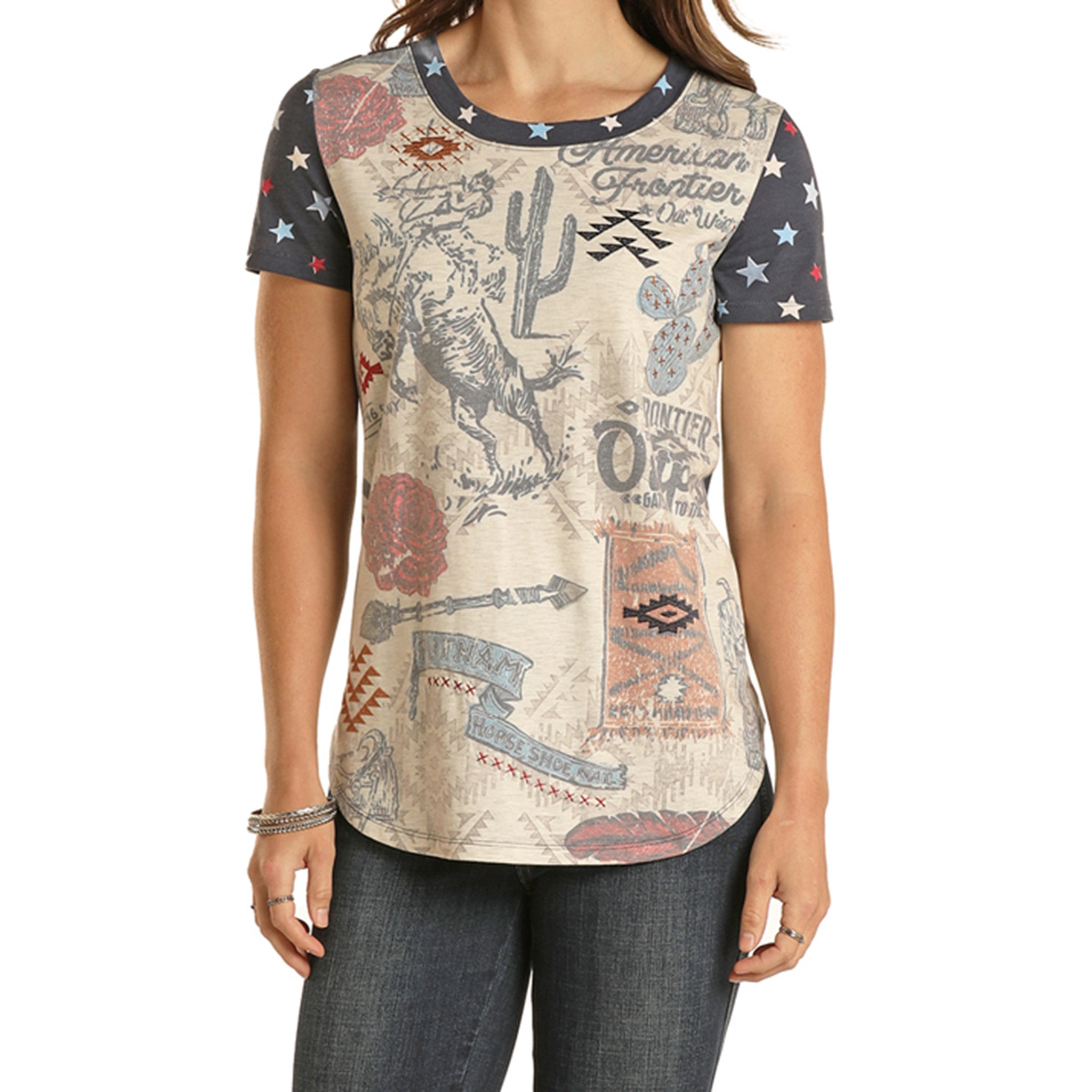 Celebrate in red, white and blue the western cowboy way with this fun shirt from Panhandle Slim! The front features a western theme with embroidered detail. The red, white, and blue stars on the back circle around to the front to complete the ensemble.