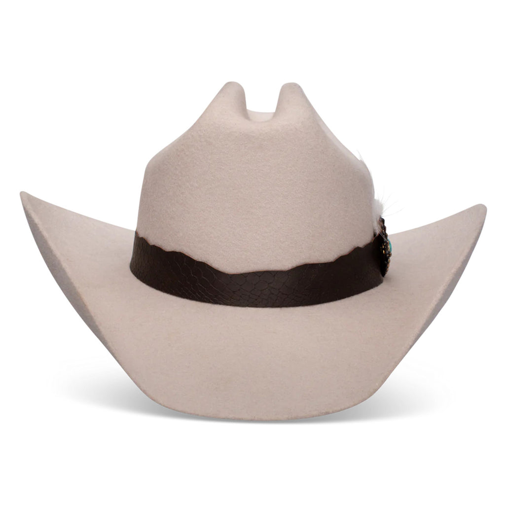 Part of the Charlie 1 Horse by Lainey Wilson Collection, the Saddle Up Hat in Silver Belly was made with the Yellowstone star and country-music chart topper in mind. The custom-made faux-snakeskin hatband is dyed chocolate brown and has an irregular cut across the band top for a jagged, adventurous look. The antique brass concho lends a turquoise and metallic highlight to the profile, and a simple white feather completes the look. On the inside, the sweatband is cloth and made for comfort. Get this hat then go saddle up!