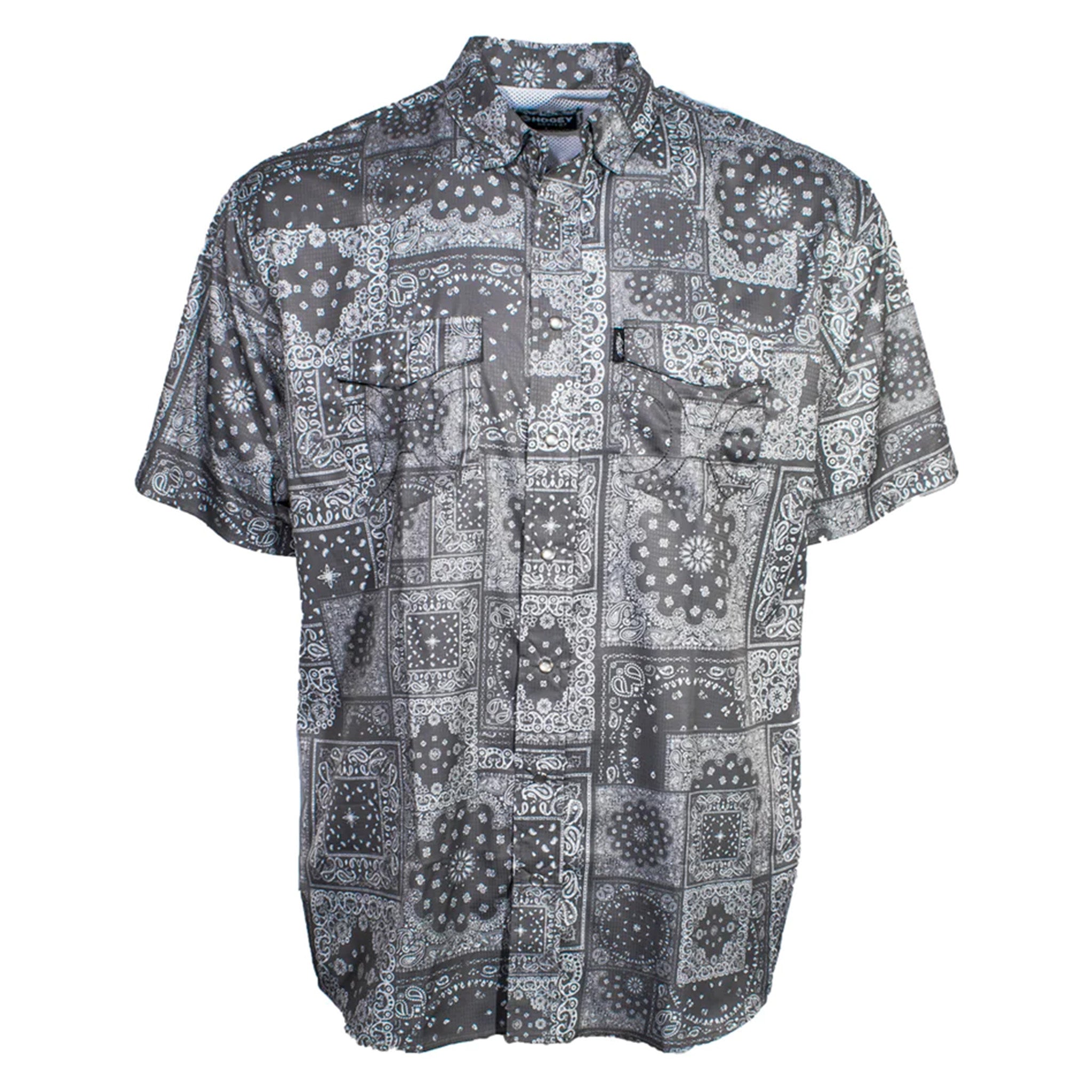 Traditional western pearl snap style with a charcoal bandana print with modern lightweight, ripstop fabric, and a vented yoke. You won't find a more comfortable fit!
