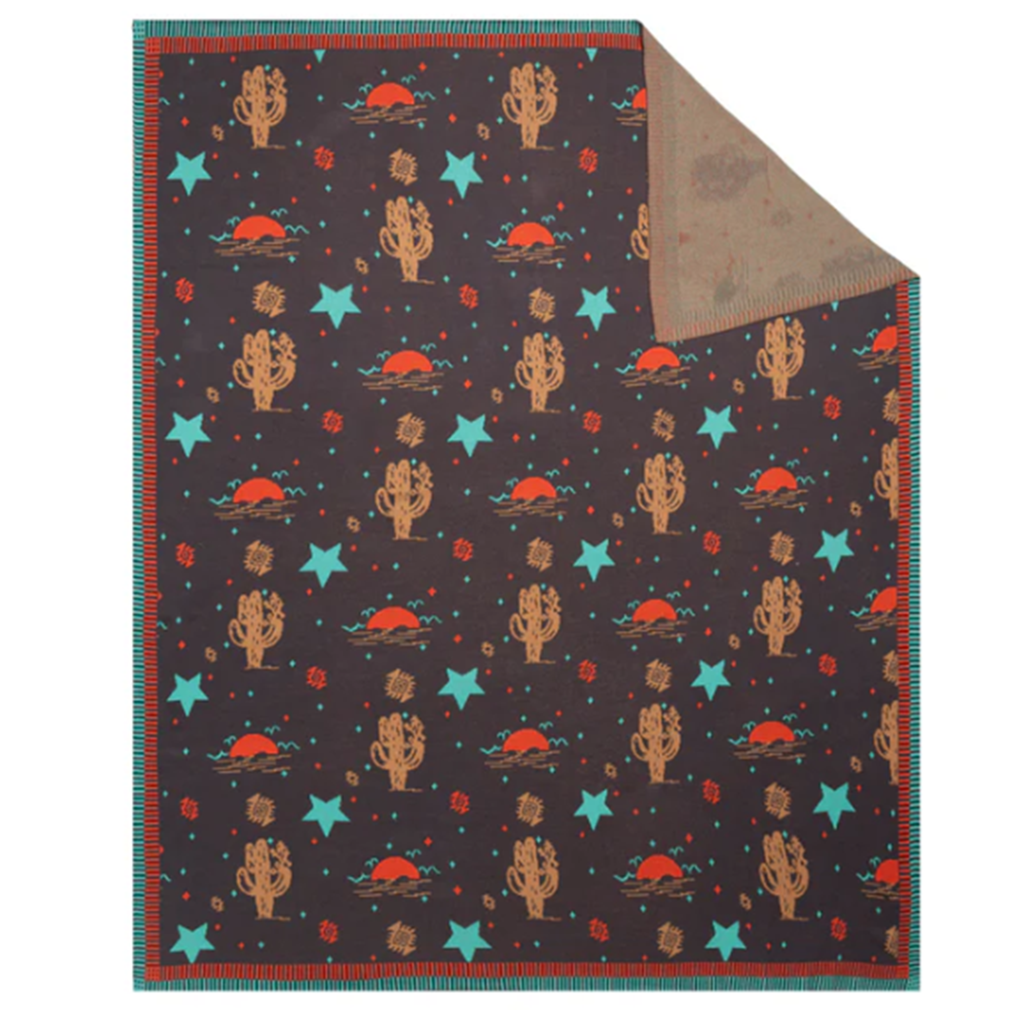 Experience the Southwest through this dynamic throw. The front features a starry night in the desert, with turquoise stars and russet cacti swaying against a rich brown sky. Red details bring to mind the warm glow of a prairie sunset. Flip it over for a tranquil, earthy pattern inspired by sunbaked adobe walls.