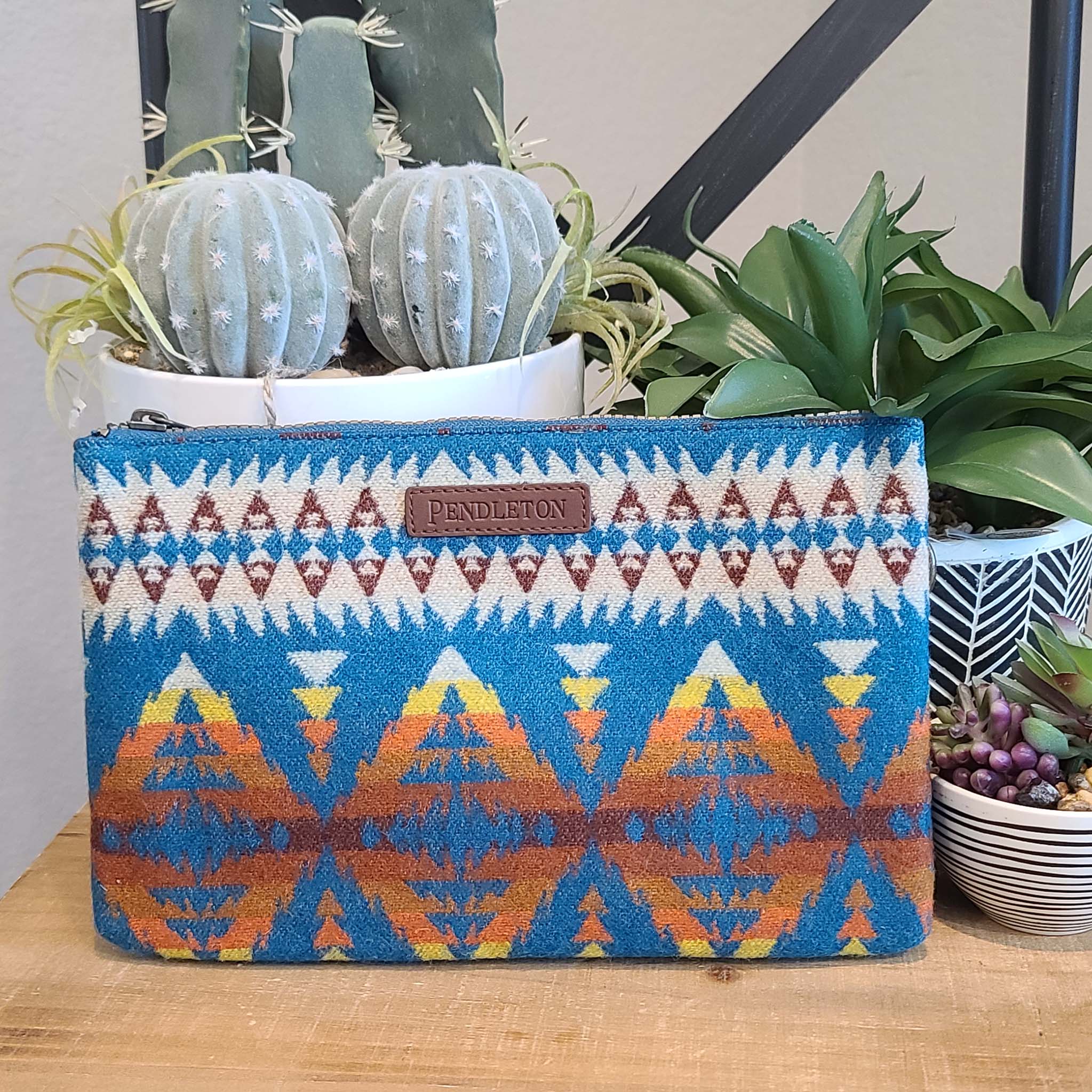 A trio of pockets hold and organize small essentials. Crafted from woven-in-USA wool jacquard, with a top zipper, and antiqued brass hardware. Leather logo patch. Pattern placement may vary.