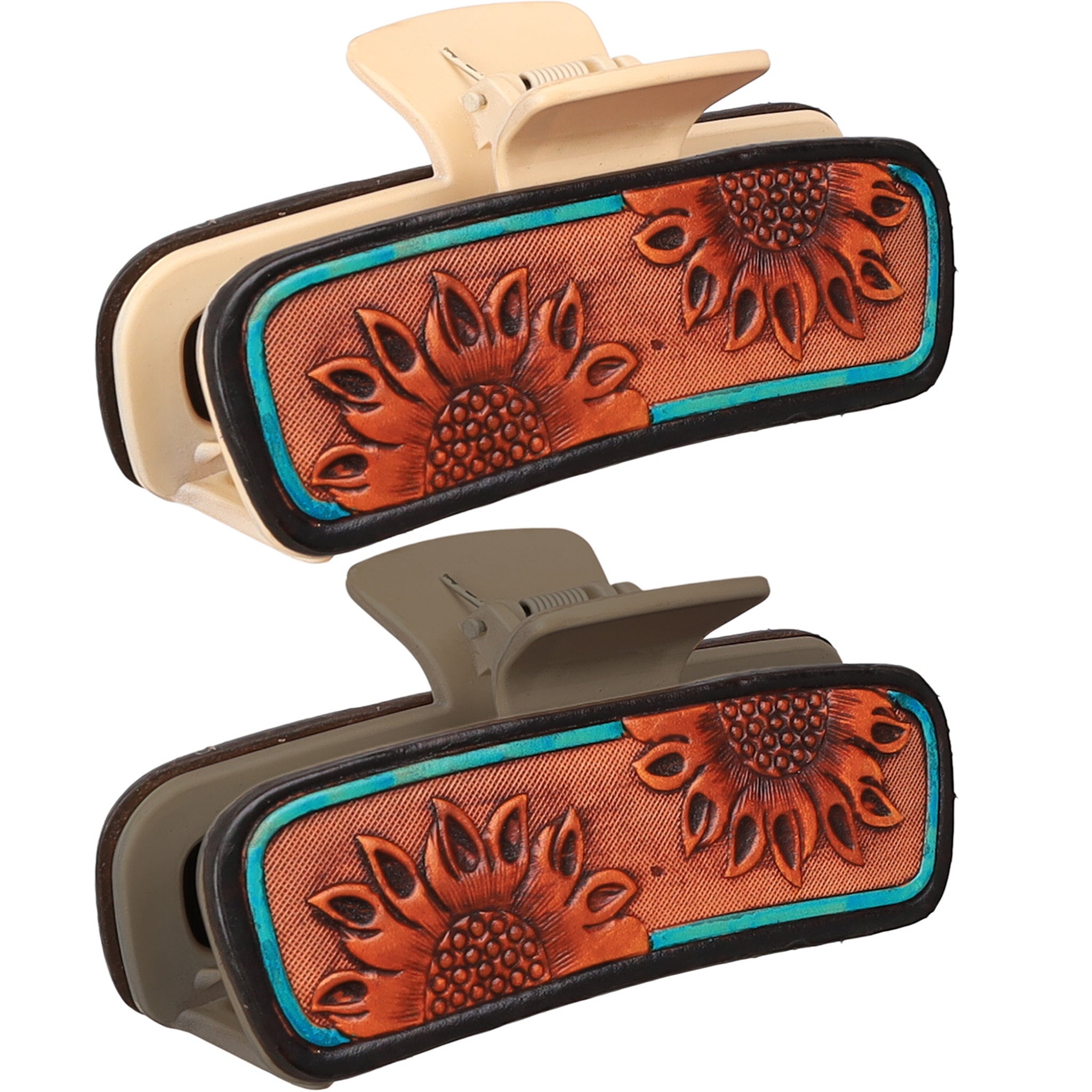 Brighten your day with this charming sunflower tooled hair clip. Featuring a cheerful sunflower design with turquoise edges, this clip combines style with practicality. The secure claw mechanism holds hair firmly in place without slipping, making it perfect for any hair type.