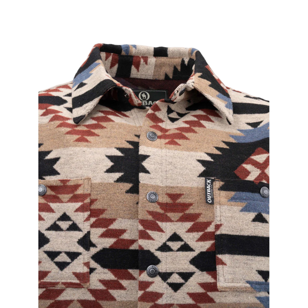 The Tan and Black Aztec Shirt Jacket blends classic Western styling with modern comfort. Featuring a bold geometric Aztec print across a warm tan and black palette, this midweight layer is built for crisp mornings, bonfire nights, and everything in between.