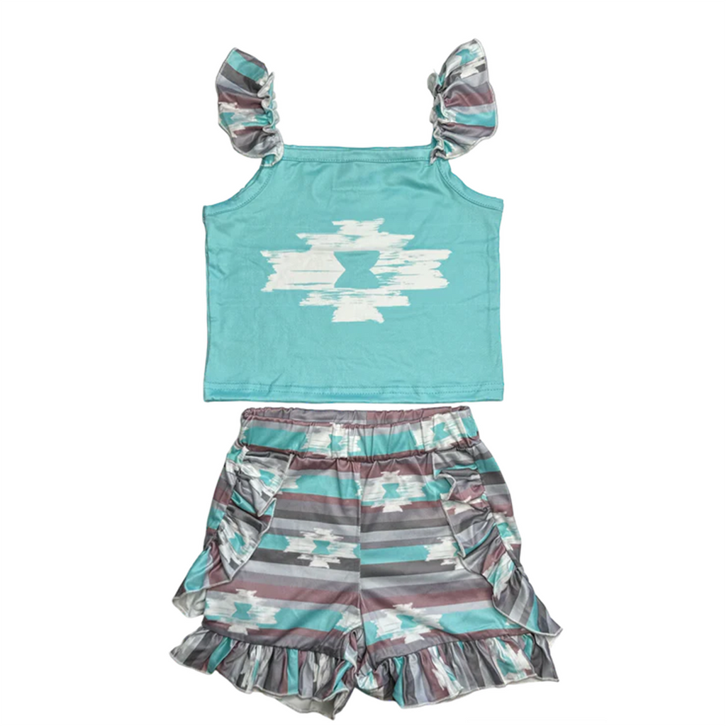 Aztec Teal Ruffle Short Set