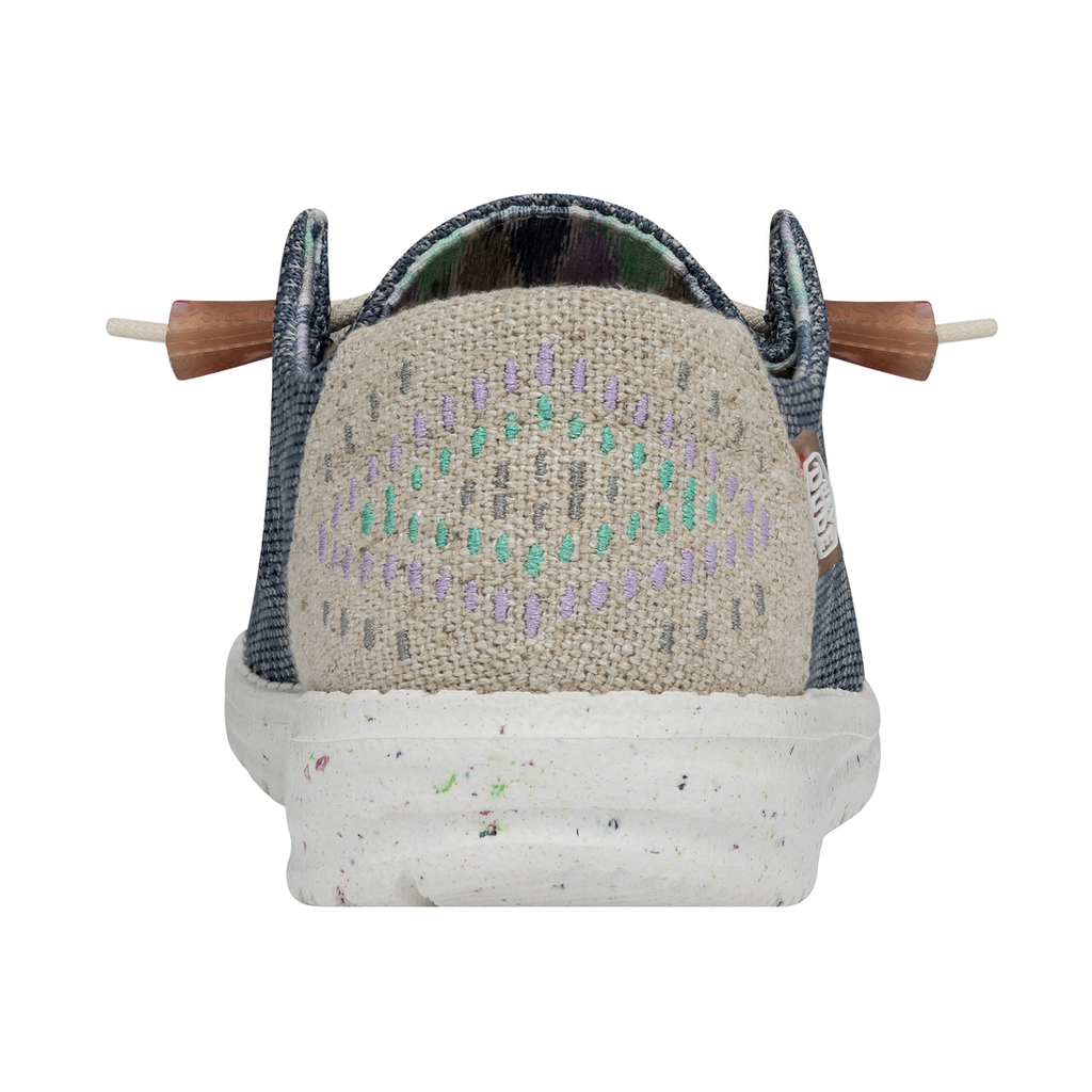 How cute are these blue denim Hey Dudes, just look at the extra detail on the heel of this shoe, so cute. The Wendy Knit II collection features our classic moc, constructed with a textured, patterned, stretch-knit woven upper. Lined with a soft, cotton-blend lining for extra comfort. Add an ultralight outsole with no-tie, elastic laces