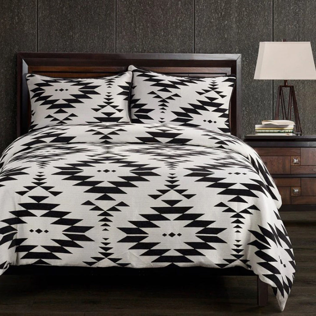 Modern monochrome combines with Aztec-inspired motifs in our Amelia Aztec Comforter Set, creating a sophisticated and balanced bedding ensemble. The symmetrical pattern draws your eyes and produces a visually stunning centerpiece for any rustic bedroom. Complete the look with Amelia's coordinating shams and pillows.