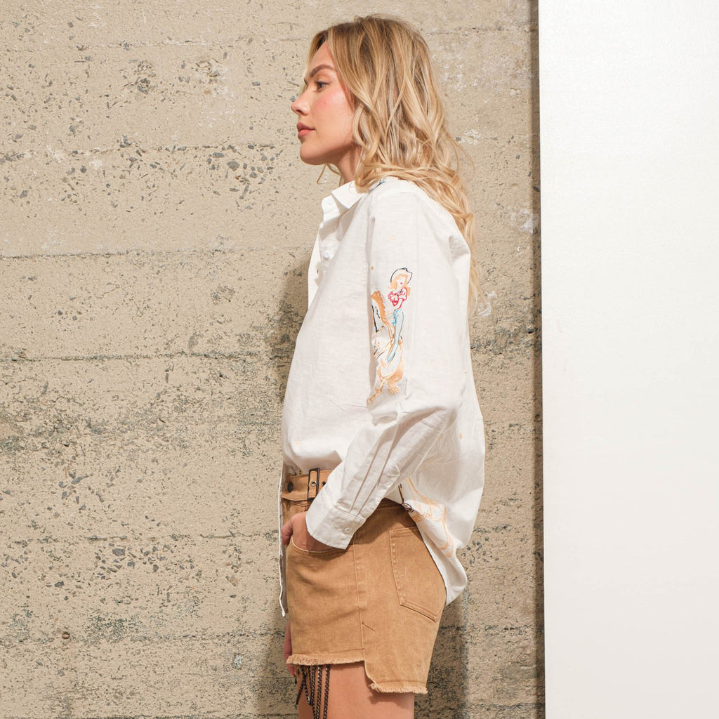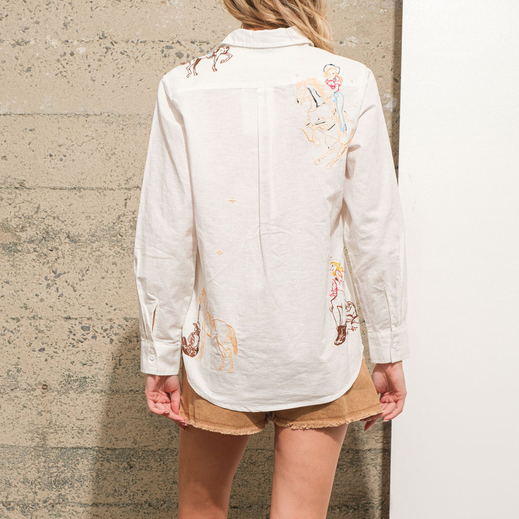 Get ready to ride into the sunset with this quirky Off White Embroidered Western Cowgirl Motifs Blouse! With playful cowgirl embroidery and a fun off-white color, this blouse is perfect for adding a touch of whimsy to any outfit.