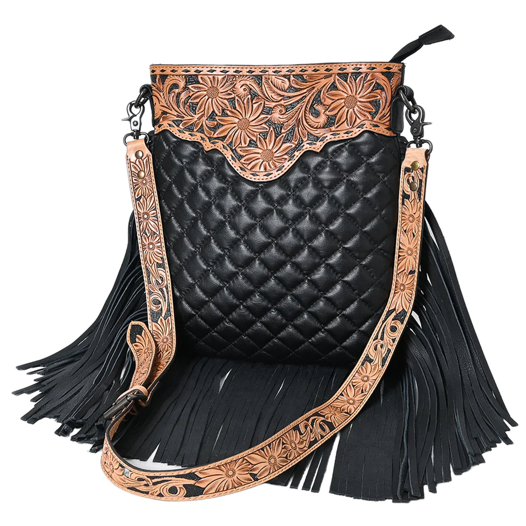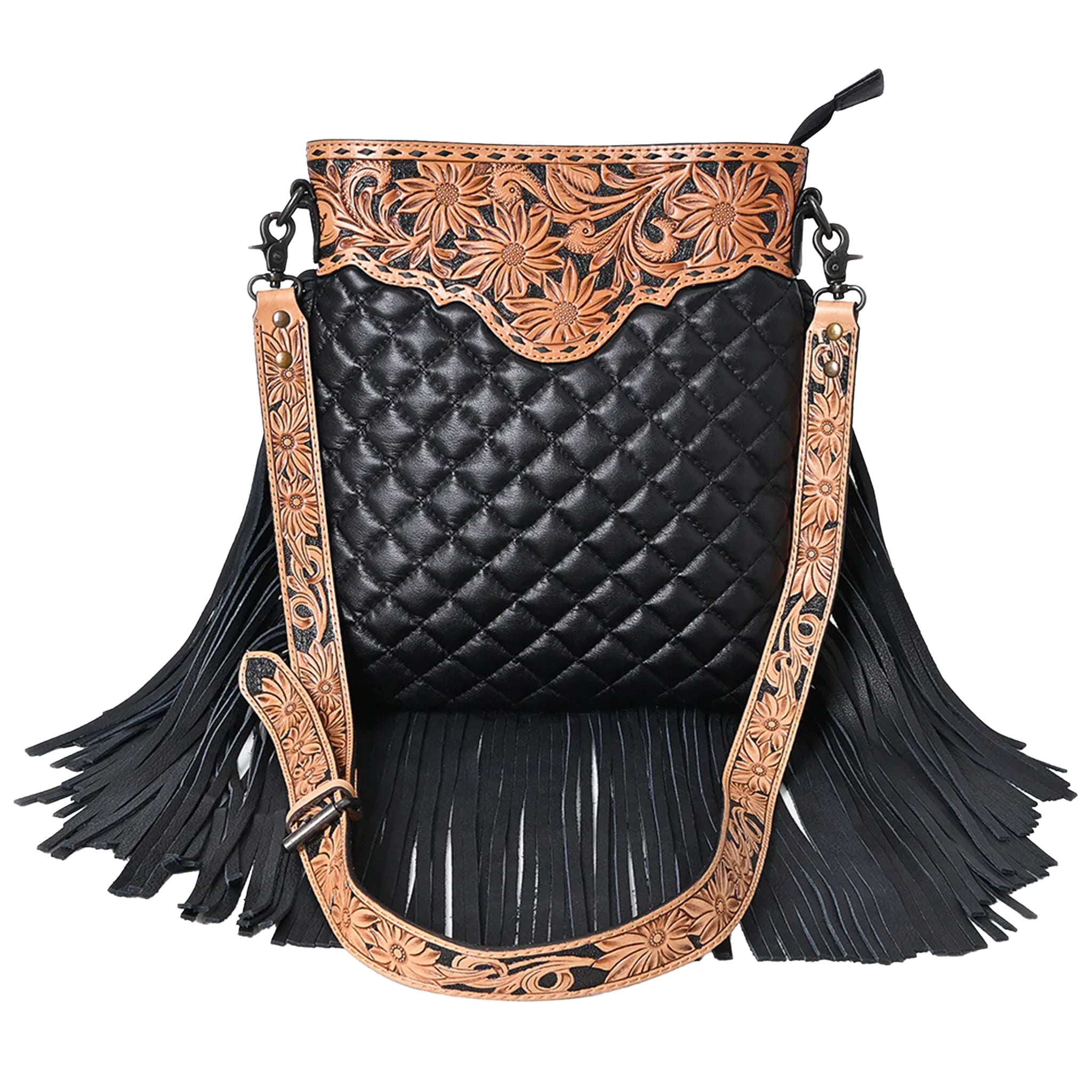 The American Darling features exquisite genuine leather fringes that add a distinctive western flair. It includes an adjustable genuine leather shoulder strap for a perfect fit and sturdy antique-finish metal hardware for lasting durability. Equipped with a reliable YKK zipper, this crossbody keeps your belongings secure. Measuring 14 inches high by 12 inches wide, it combines style and practicality effortlessly.