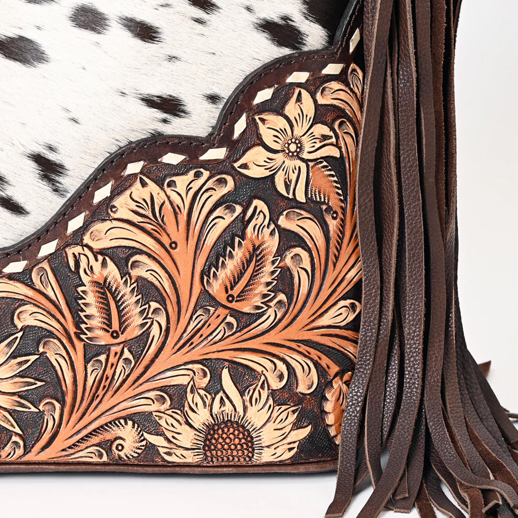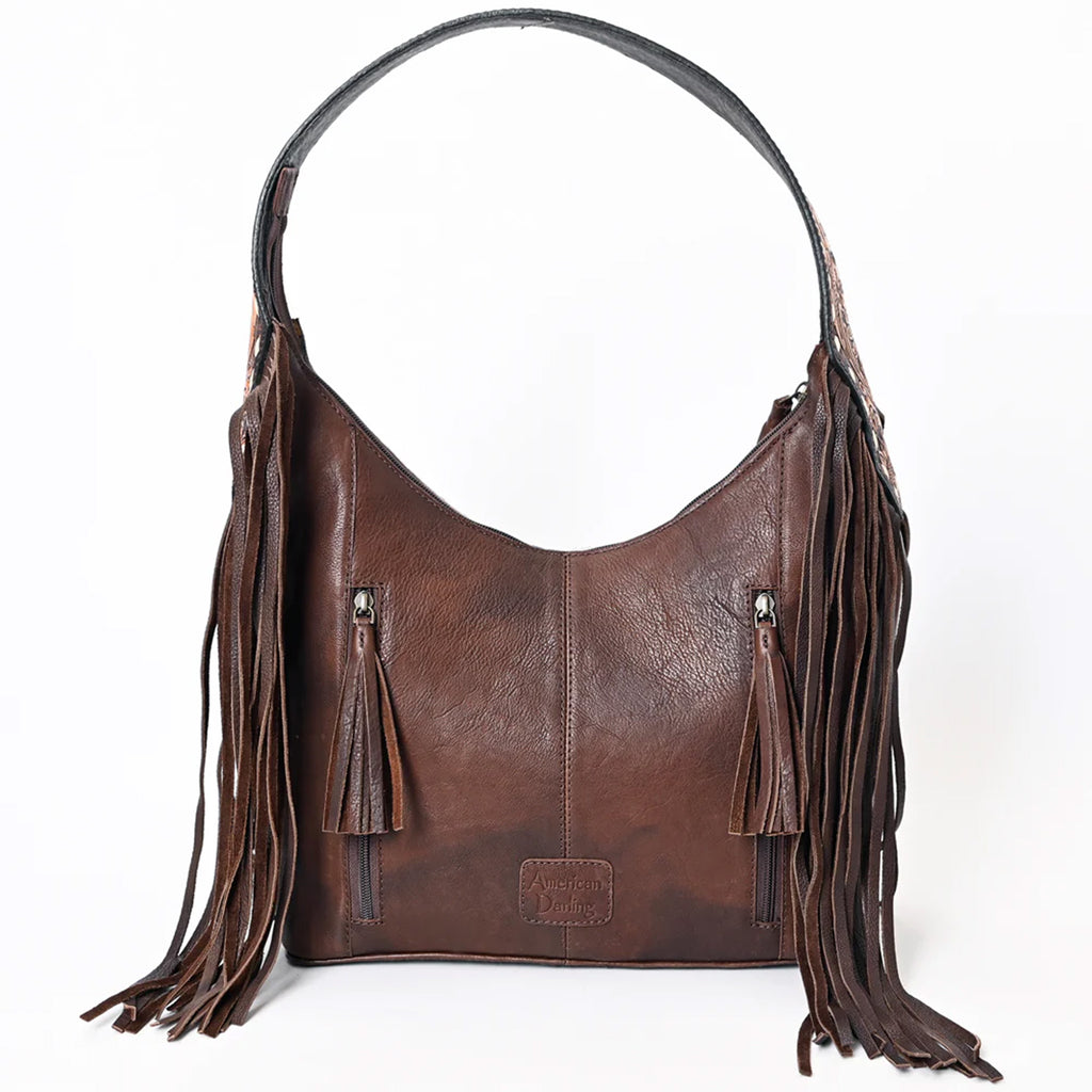 Elevate your style with the American Darling Tooled Hide Fringe Purse, a refined accessory crafted from intricately tooled leather. Its delicate fringe detailing adds a touch of timeless elegance, while the durable construction ensures lasting beauty. Perfect for those who appreciate artisanal craftsmanship and sophisticated design, this purse seamlessly blends classic charm with everyday functionality.