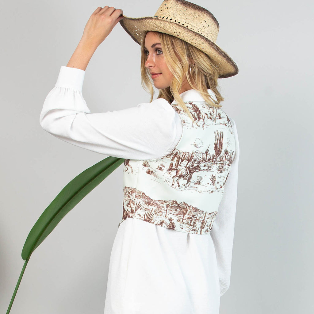 Saddle up in style with our women's mocha western print vest. This unique vest features a playful western print that will add a touch of whimsy to any outfit. Made with high-quality materials, this vest is both durable and chic. Perfect for any cowgirl with a sense of humor!