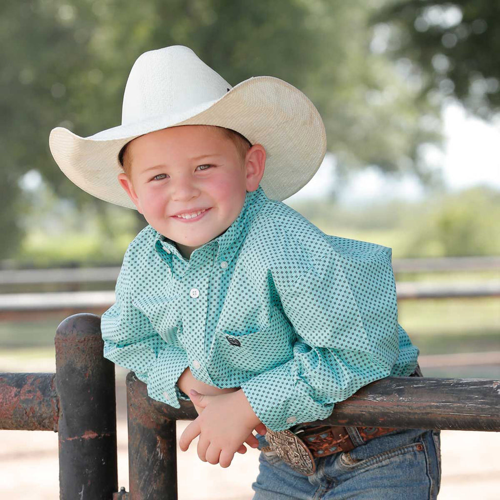 Dress him like the big boys in our handsome light blue printed cotton plain weave that shows off any denim and boots. Just like dad's, this classic shirt features an open left front pocket with embroidered Cinch logo and cream buttons.
