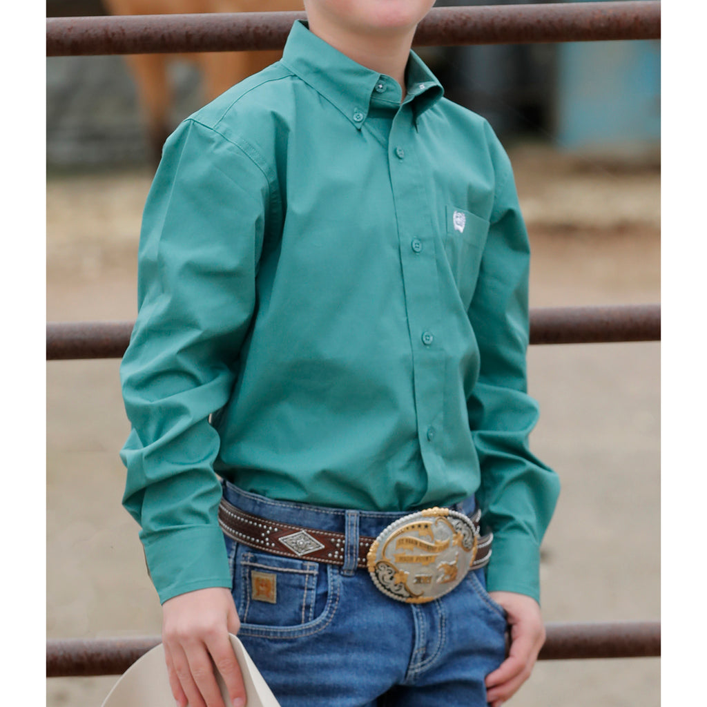 Keep your little one comfortable and stylish in our Cinch solid green long sleeve shirt. Made with high-quality fabric, this shirt will keep him feeling cool and looking sharp all day long. Perfect for any occasion, it's a must-have addition to his wardrobe.