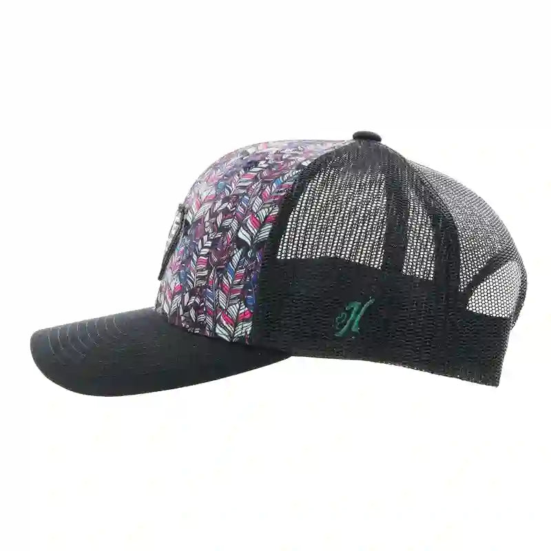This awesome looking mid profile 6-panel cap has a printed fabric front. Red, white and blue feathers cover the front of this cap. The back is made of a black mesh for ventilation. OSFA adjustable backstrap also covered in feather fabric! Black bill and black/white Rope Like A Girl patch! Turquoise H for Hooey embroidered on left side panel.