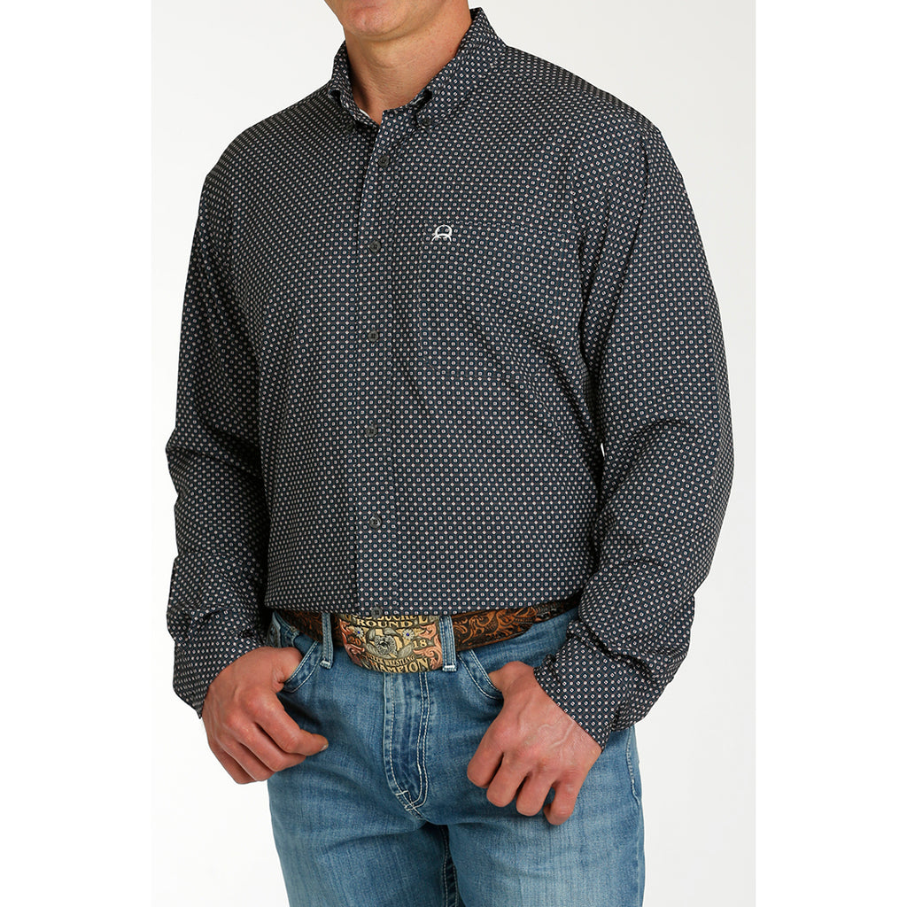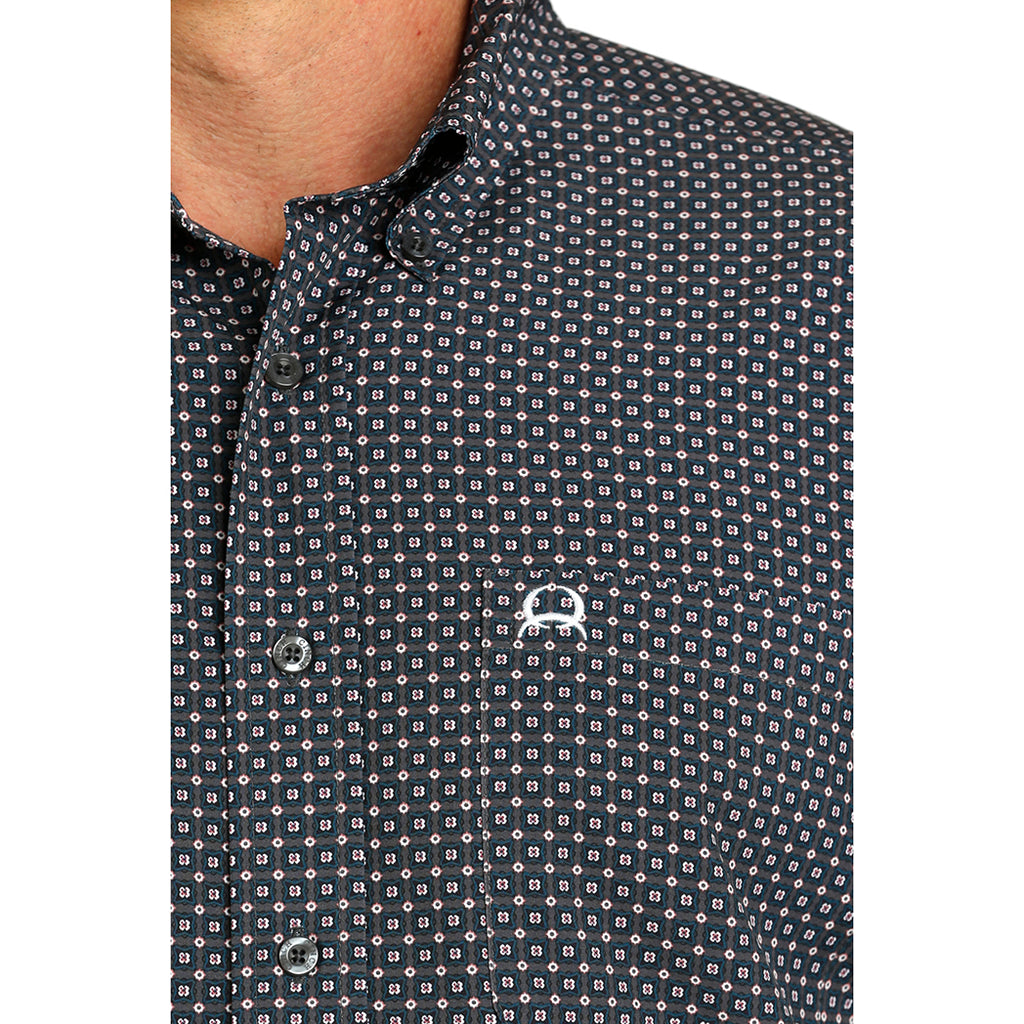 Make a statement in this Navy Geo Print Cinch Arenaflex button down. Its flexible poly-spandex engineering delivers the ultimate moisture wicking, breathable, quick-dry performance with an open left front pocket that sports the embroidery logo.