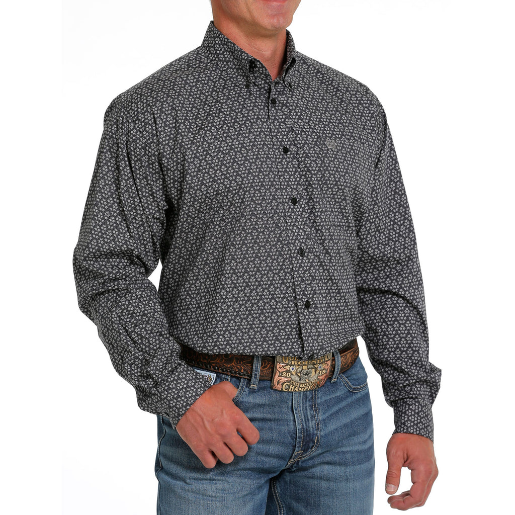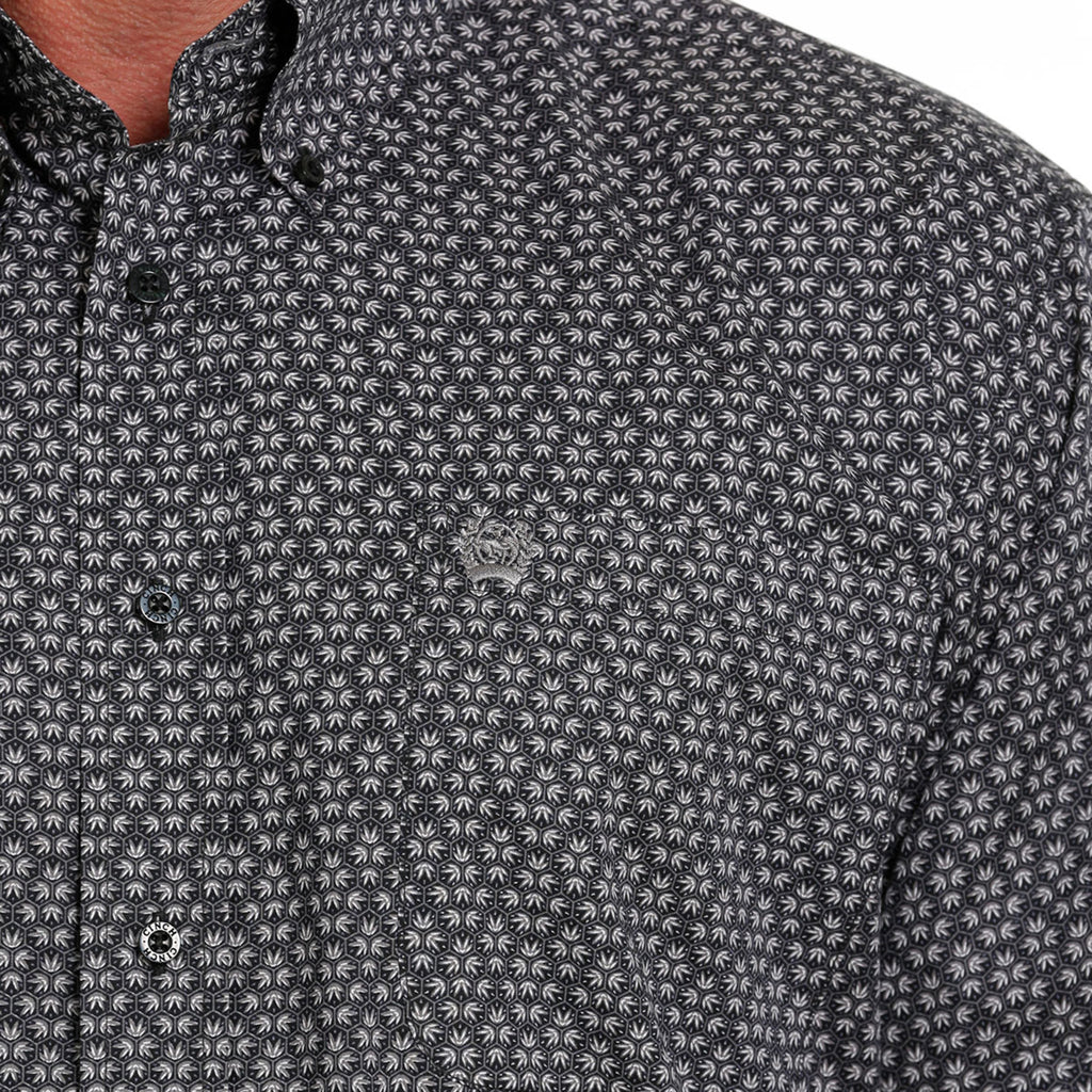 Featuring classic button-down good looks, this black printed shirt by CINCH is updated with a modern geometric print, plaid contrast trim, open left front pocket with embroidered logo and black buttons. Pair yours with new blue jeans and boots.