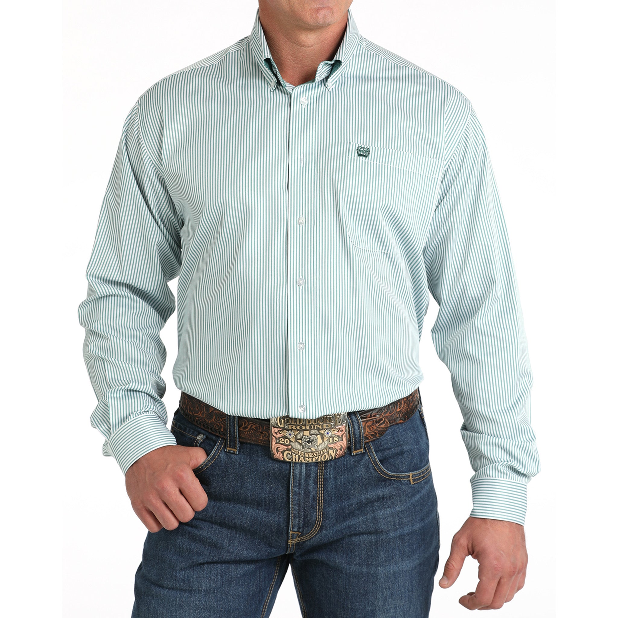 High-performance days call for stylish options that meet the challenge, like this green striped poly/Tencel/cotton twill weave by Cinch. Soft and breathable, this sporty shirt features green geometric contrast trim, an open left front pocket with embroidered logo and white buttons.