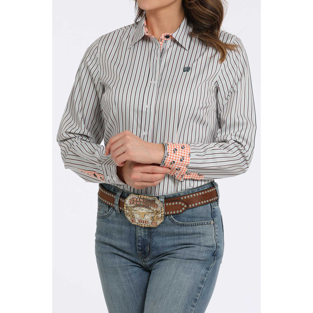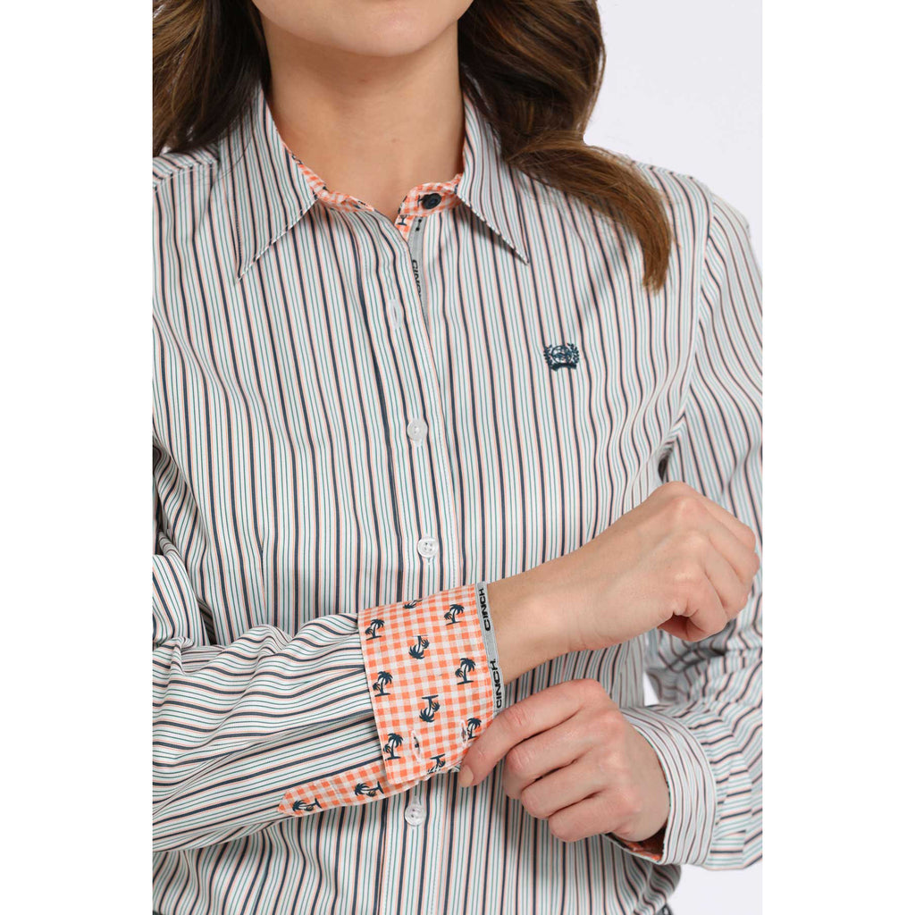 This shirt pops with white fabric decorated by evenly spaced navy, orange, and turquoise pinstripes—perfect for a bright summer vibe. The front keeps it cool and simple with classic white buttons and a cute little embroidered Cinch logo for a fun finishing touch.