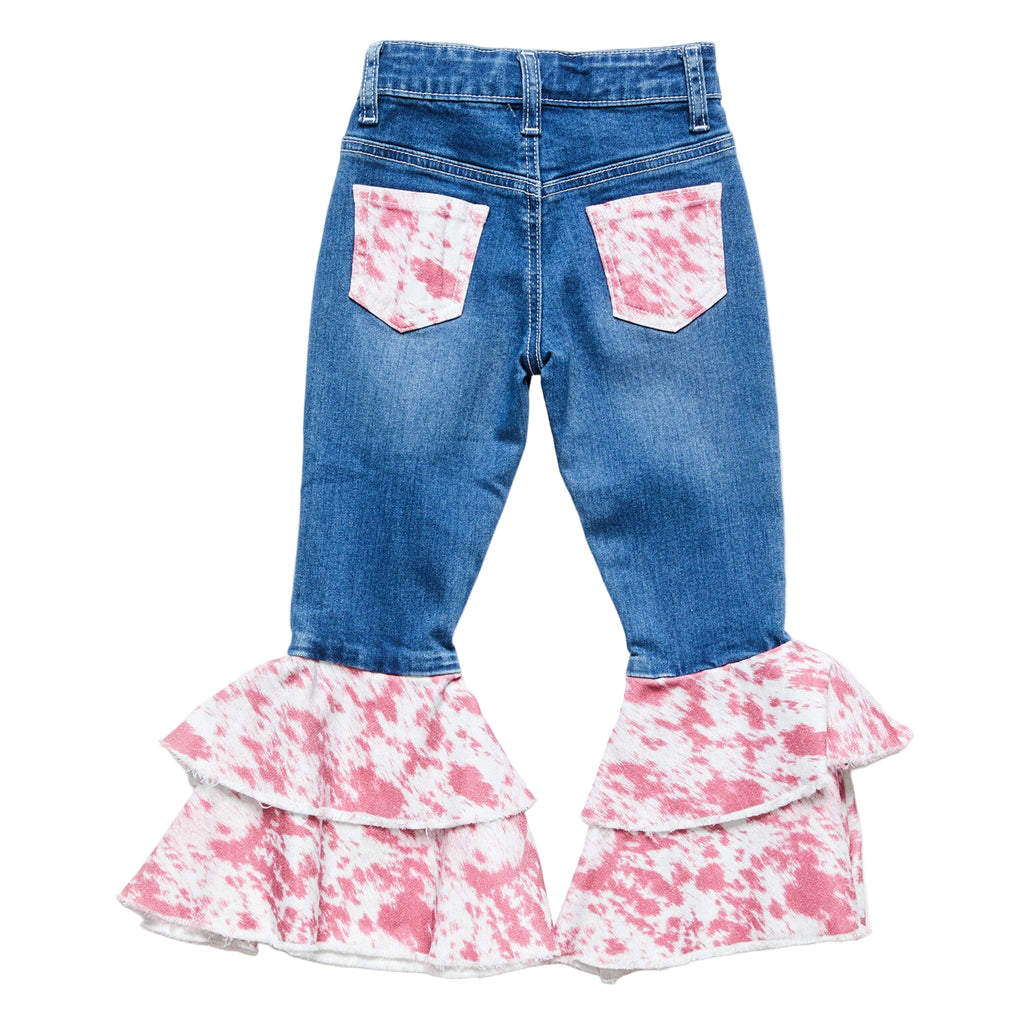 Let her strut with sass in the Girl’s Pink Cow Print Double Ruffle Jeans by Cowgirl Hardware. These stylish flare jeans feature a bold pink cowhide pattern with double-tiered ruffles at the hem, adding a fun and feminine touch to any outfit. Crafted from durable stretch denim, they’re built for playdates, rodeos, and everyday adventures.