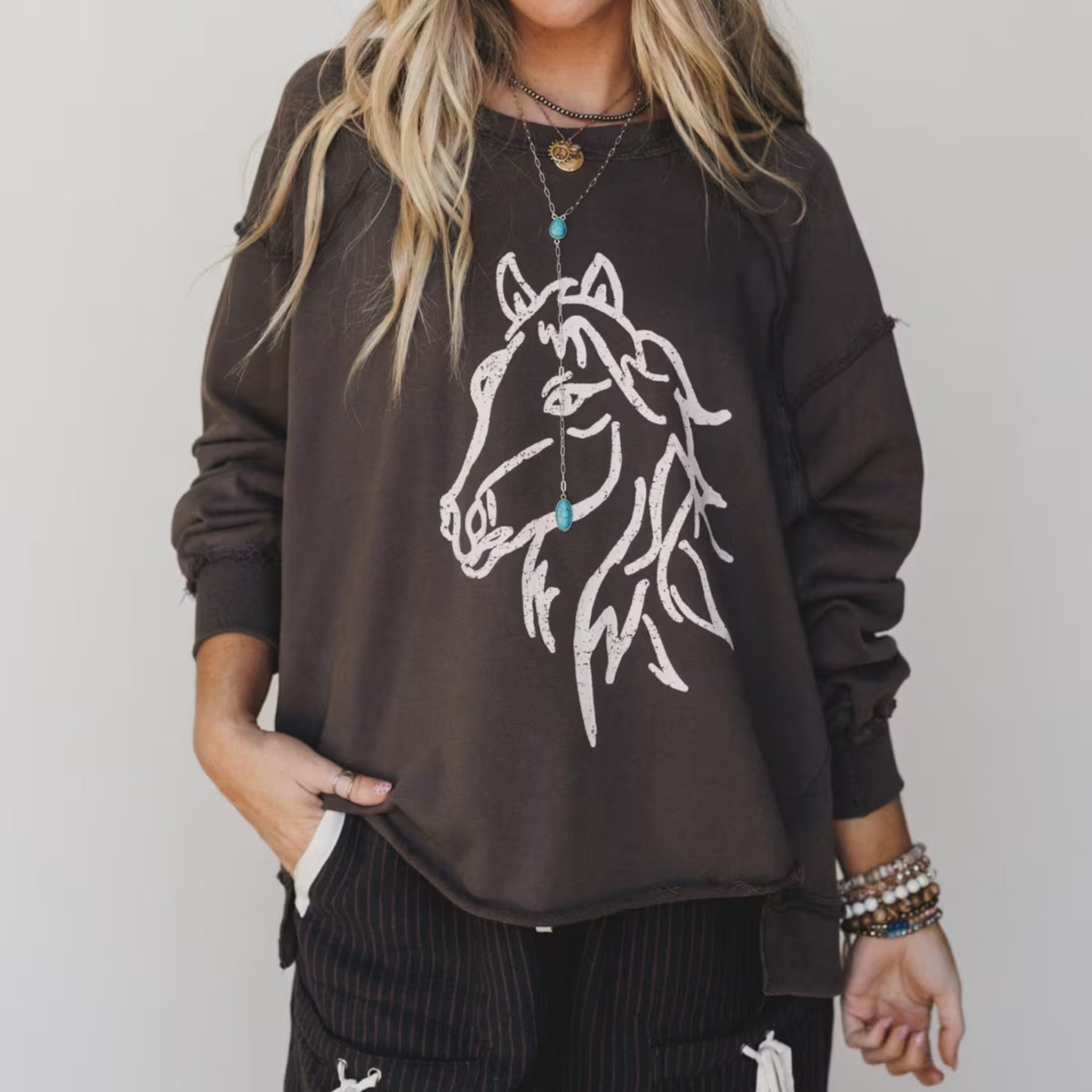 This graphic sweatshirt features a raw edged neckline, and exposed seaming throughout, finished with ribbed cuffs, distressed hemline accents, and a horse motif for a playful meets rugged look.