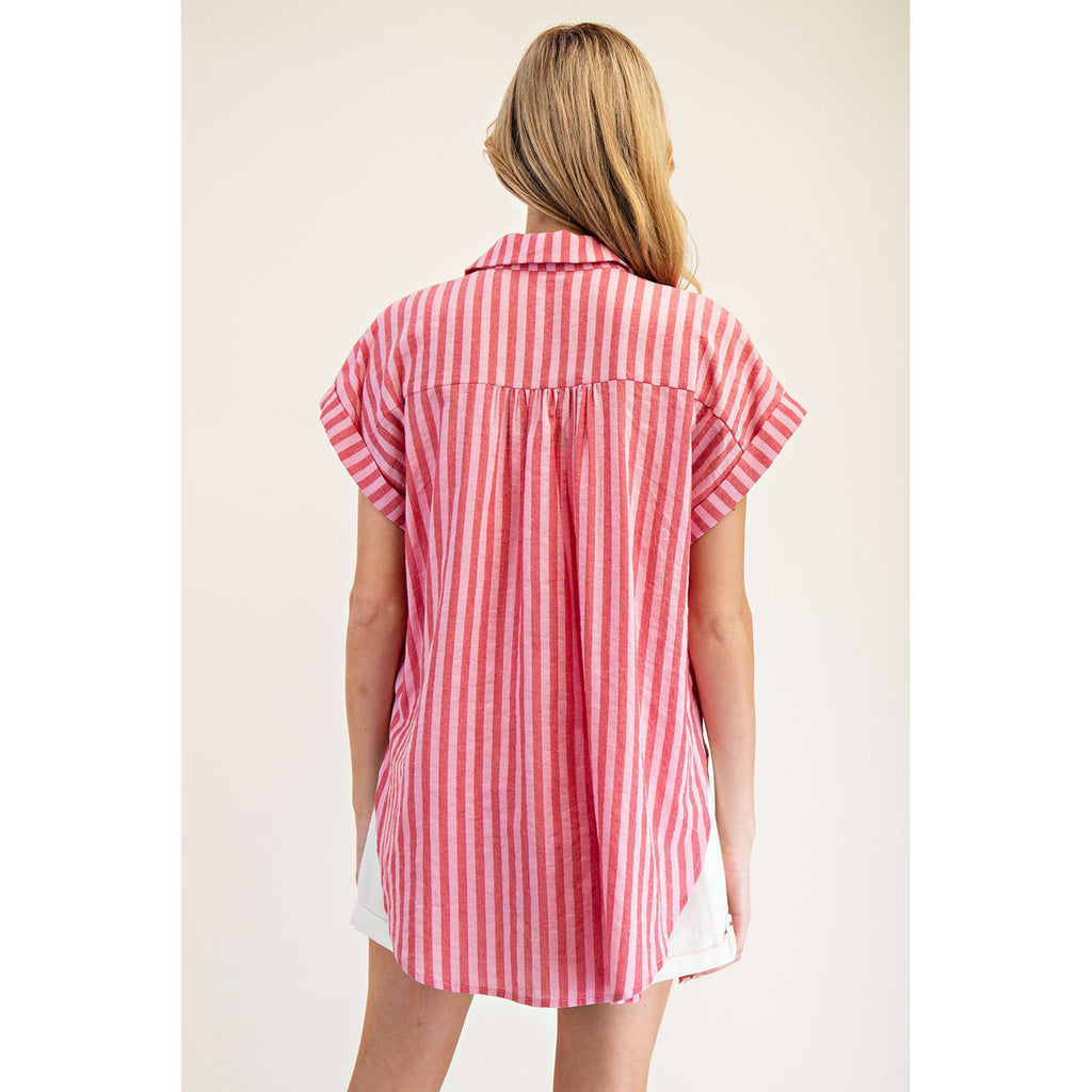 Add a pop of color to any outfit with this Red and Pink Stripe Button Down Shirt. Perfect for a casual day out, this shirt will make you stand out in the crowd. Show off your playful style with its vibrant stripes and comfortable fit.