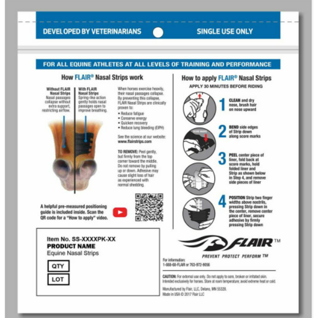 Flair Strips are drug-free self-adhesive nasal strips that support horses' nasal passages and promote optimum respiratory health of equine athletes, in all disciplines and every level of competition. When horses exercise heavily, their nasal passages collapse, Flair Nasal Strips are clinically proven to help horses breathe easier, reduce fatigue, conserve energy, recover faster, and Protect from EIPH (lung bleeding).