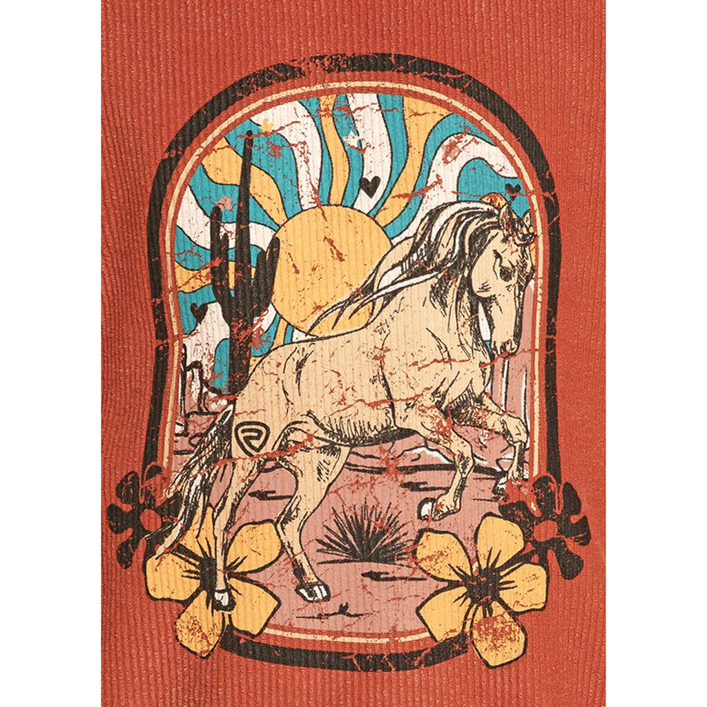 Saddle up for style with this rust-colored pullover featuring a bold desert horse graphic that captures the wild spirit of the West. Perfect for young riders and horse lovers, this cozy layer brings vintage rock & roll vibes with a southwestern twist.
