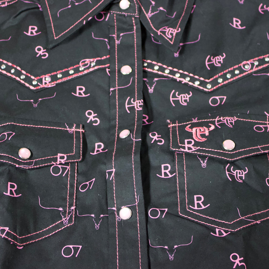 Turn up the ranch style with this girl's long sleeve western shirt. It's covered in an all-over pink branding iron print that gives it true cowgirl character. Featuring pearl snaps and western yokes, this shirt is a ranch-ready classic.