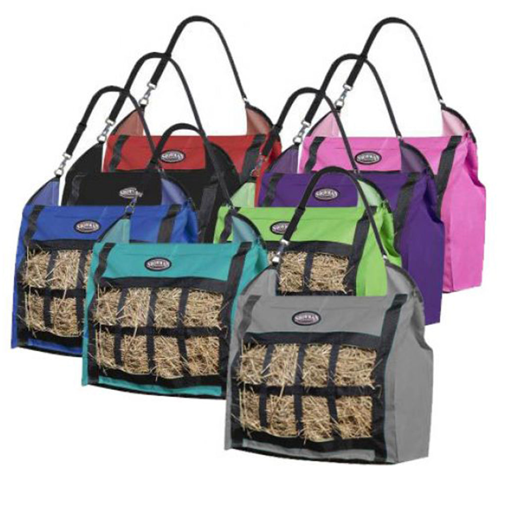 This durable heavy duty nylon hay tote is easy to fill and carry. Adjustable nylon strap with clasp. Large capacity opening with covered bars give added stability. Velcro closure and flip over Velcro flat to keep hay secure. Small front squares allow small amounts of hay to be consumed at a time, helping digestion. Mesh bottom allows dust to fall through while keeping hay in the bag.