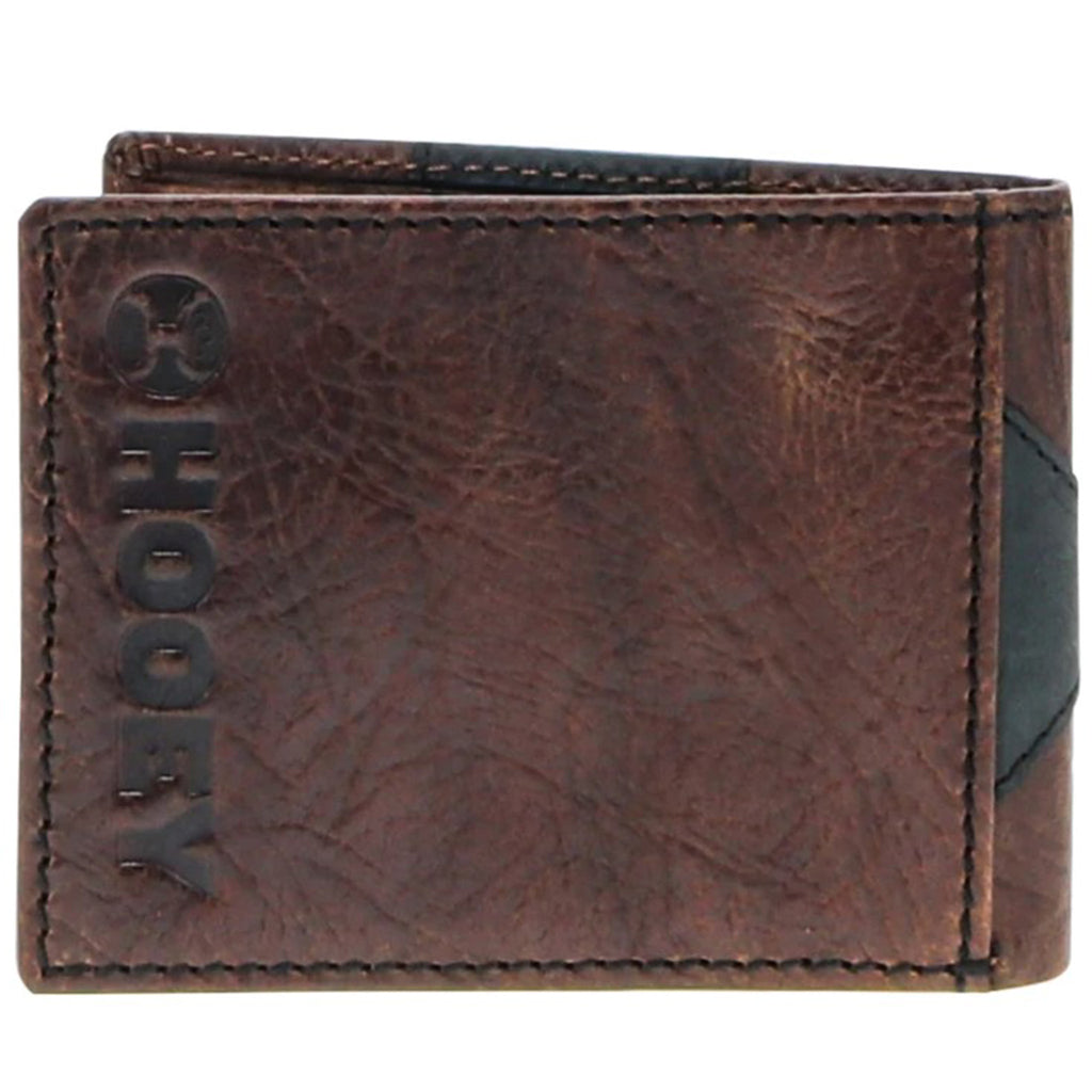 This men's Hooey front pocket bifold wallet features brown, black & tan patchwork exterior, & brown interior detailed with a tan accent pocket. Includes the custom hooey brand woven logo liner.