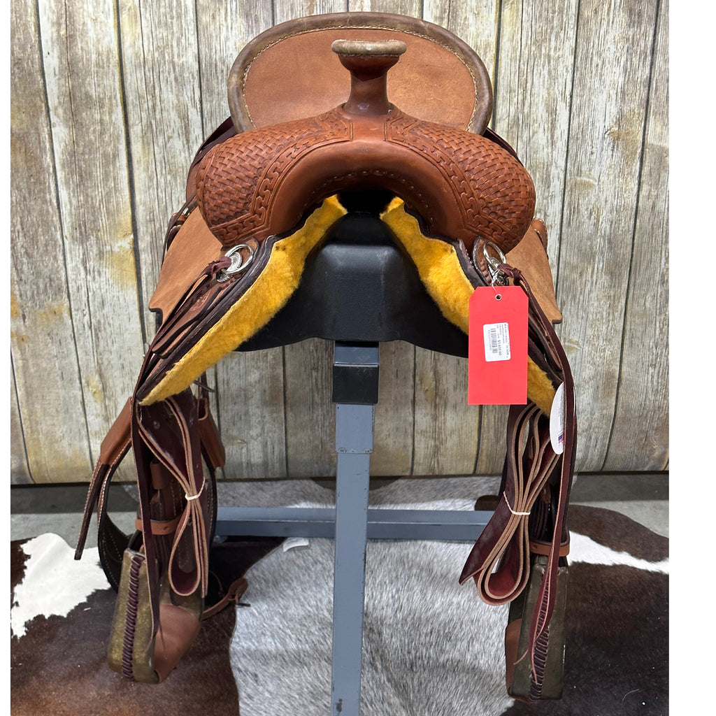 HR Saddlery is out here making beautiful saddles. This 16 Inch Modified Draft Association Saddle is another saddle that did not disappoint. Look at the detail on the basket weave tooling and then again on the tooling on the border. This is made with a draft tree to fit all your draft horses, draft horse crosses, and your thicker horses that the normal tree does not fit.