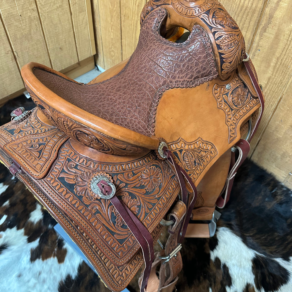 Check out this saddle's stunning hand-tooled flowers and dark antique finish! With pre-turned fenders and a faux elephant print seat, it's perfect for staying in the saddle while turning calves on the fence. This saddle's got it all!