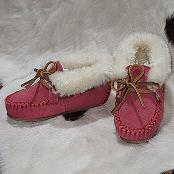 Your little one will be able to be cozy and comfy on those cold nights with these adorable pink suede slippers! Faux Fur Lining and cuff, rawhide laces that adjust for the perfect fit. These slippers offer heel to toe comfort cushion insoles plus a durable rubber outsole!