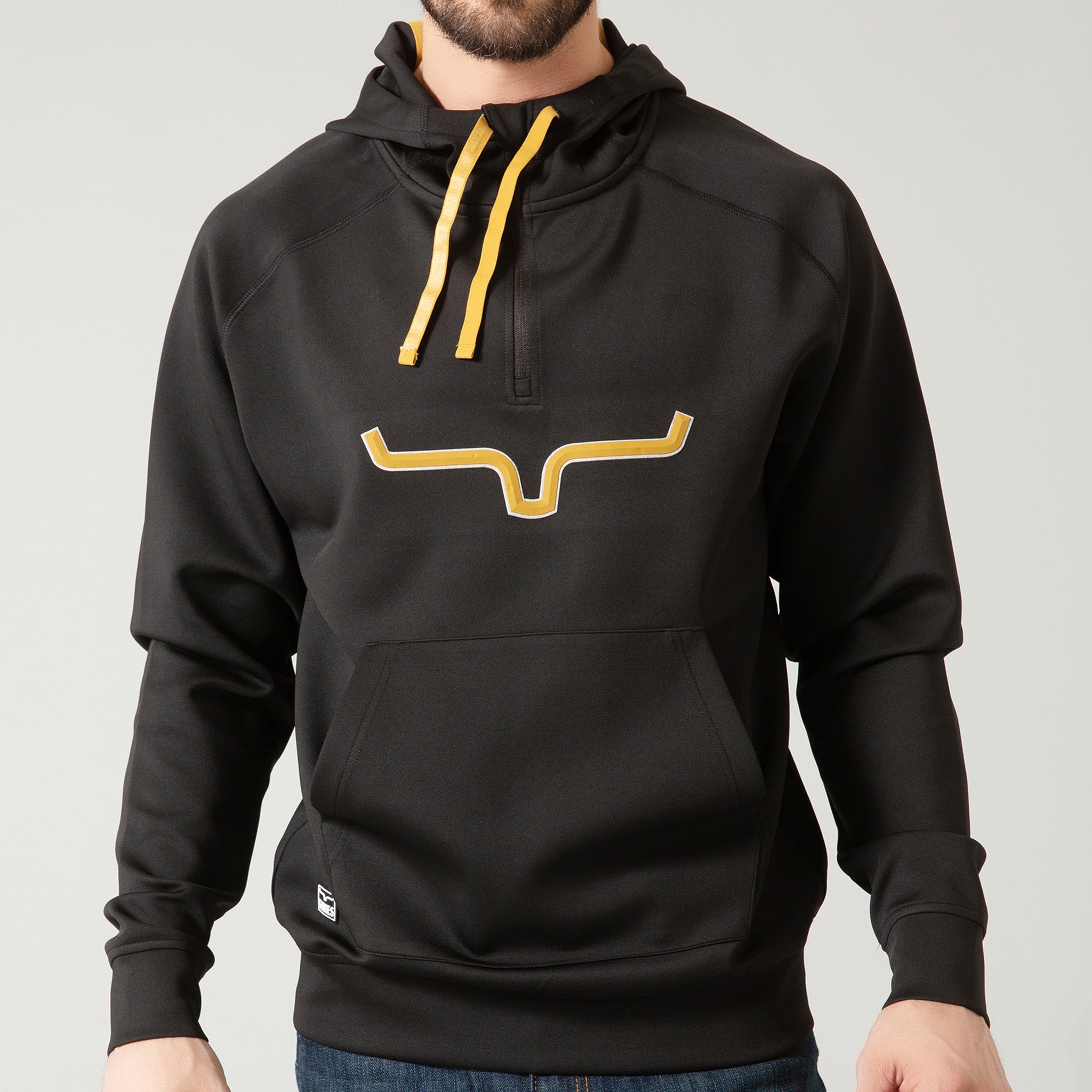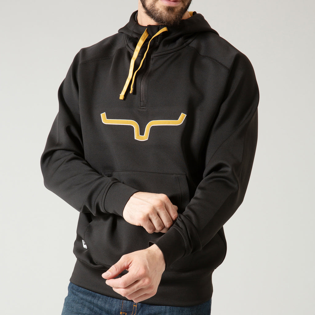 With a comfortable fit and simple design, the Rockford Tech Hoodie from Kimes Ranch is a favorite. It features embroidered brand horns with a signature applique. Accents include contrasting adjustable drawstrings and a small leather logo patch on the lower right of the pouch pocket.