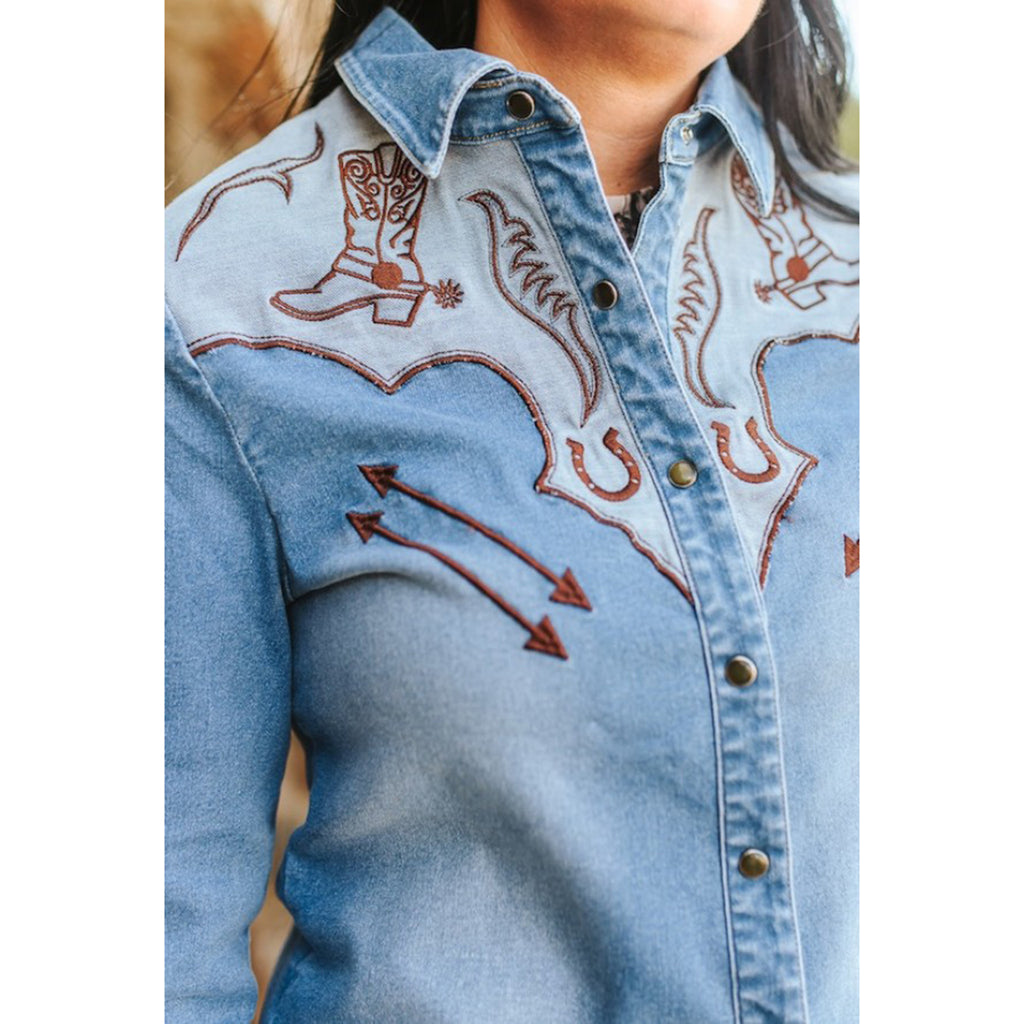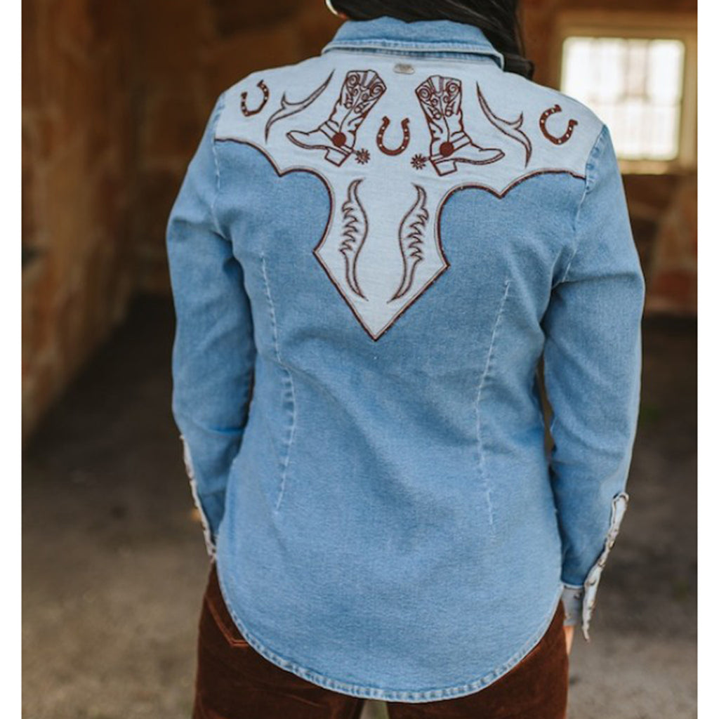 Featuring a striking two-tone design that pairs denim with rich brown tones, this shirt showcases authentic western emblems across the yoke for that true cowgirl spirit. Perfect for ranch days, country nights out, or anyone who loves bold western flair. The classic yoke detailing adds traditional charm while the color combo keeps things fresh and versatile.