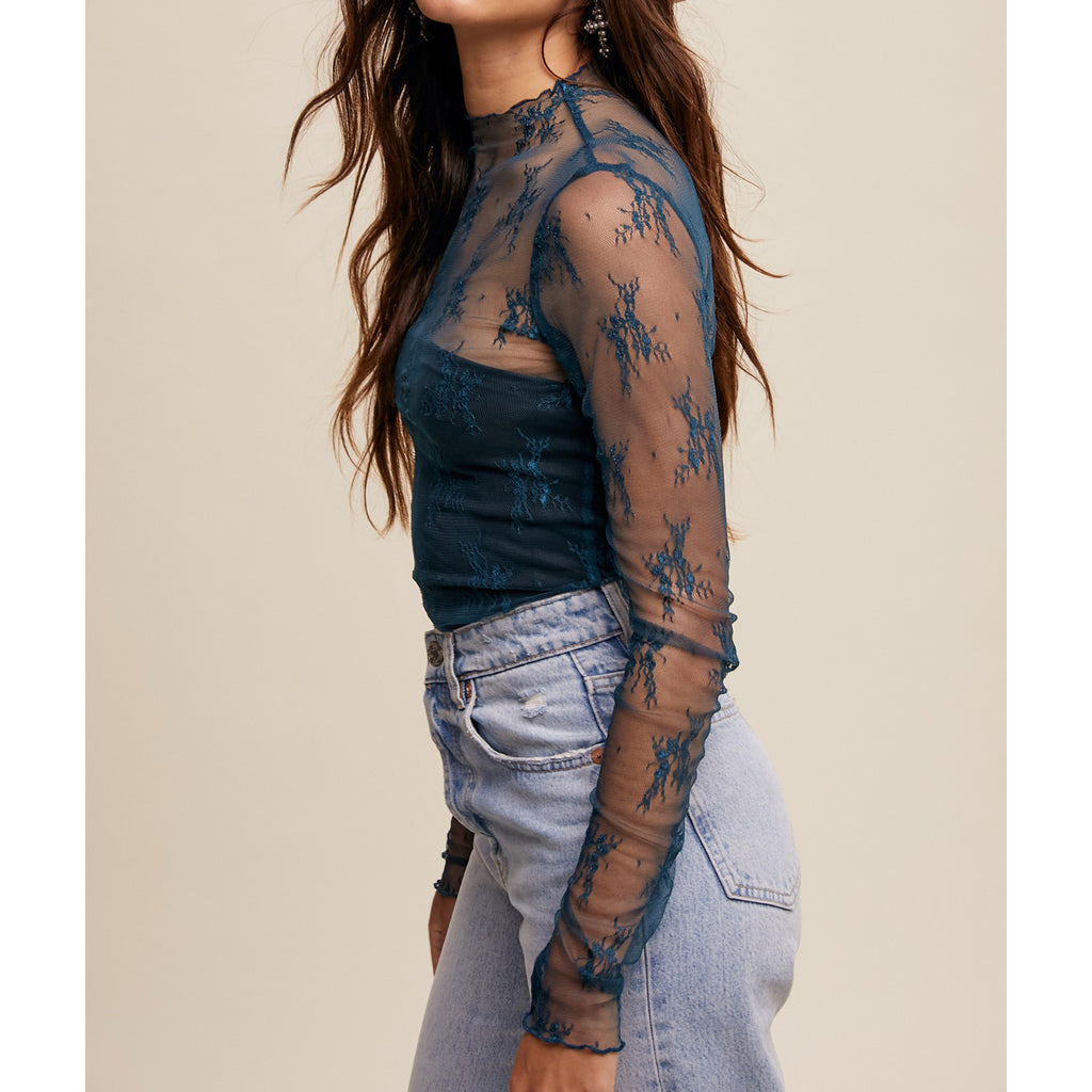 Unleash your daring side with our Teal Lace Mesh Long Sleeve Top. Get ready to turn heads with its bold design and strong presence. Made with intricate lace mesh and long sleeves, this top will make you feel confident and adventurous. Perfect for any occasion, its unique features will make you stand out from the crowd.