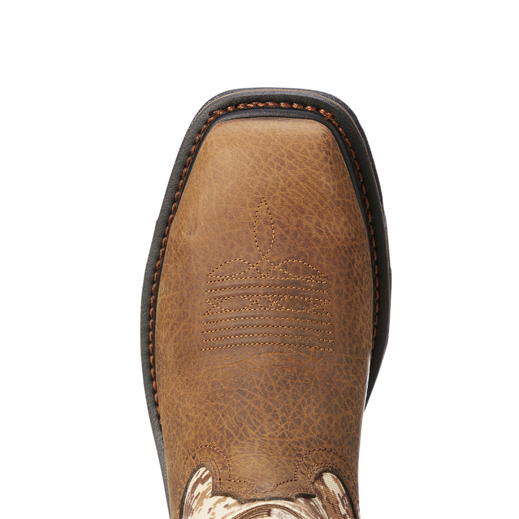 Show your pride on the job with the Ariat WorkHog Patriot Work Boot, built for durability and designed with purpose. Featuring a premium full-grain leather foot and a sand camo textile shaft with an American flag patch, this boot blends bold style with serious function. Engineered with ATS® Max technology, it delivers superior stability and reduces foot fatigue during long workdays.