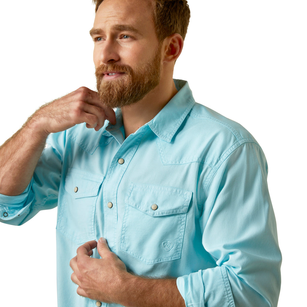 Turn heads with the Ariat Men's Solid Aquatic Long Sleeve Shirt, where classic Western styling meets modern performance. This fitted shirt features pearl snap closures for a timeless cowboy touch, along with Greater Arm Mobility™ for unrestricted movement and a wrinkle-resistant finish that keeps you looking sharp all day.