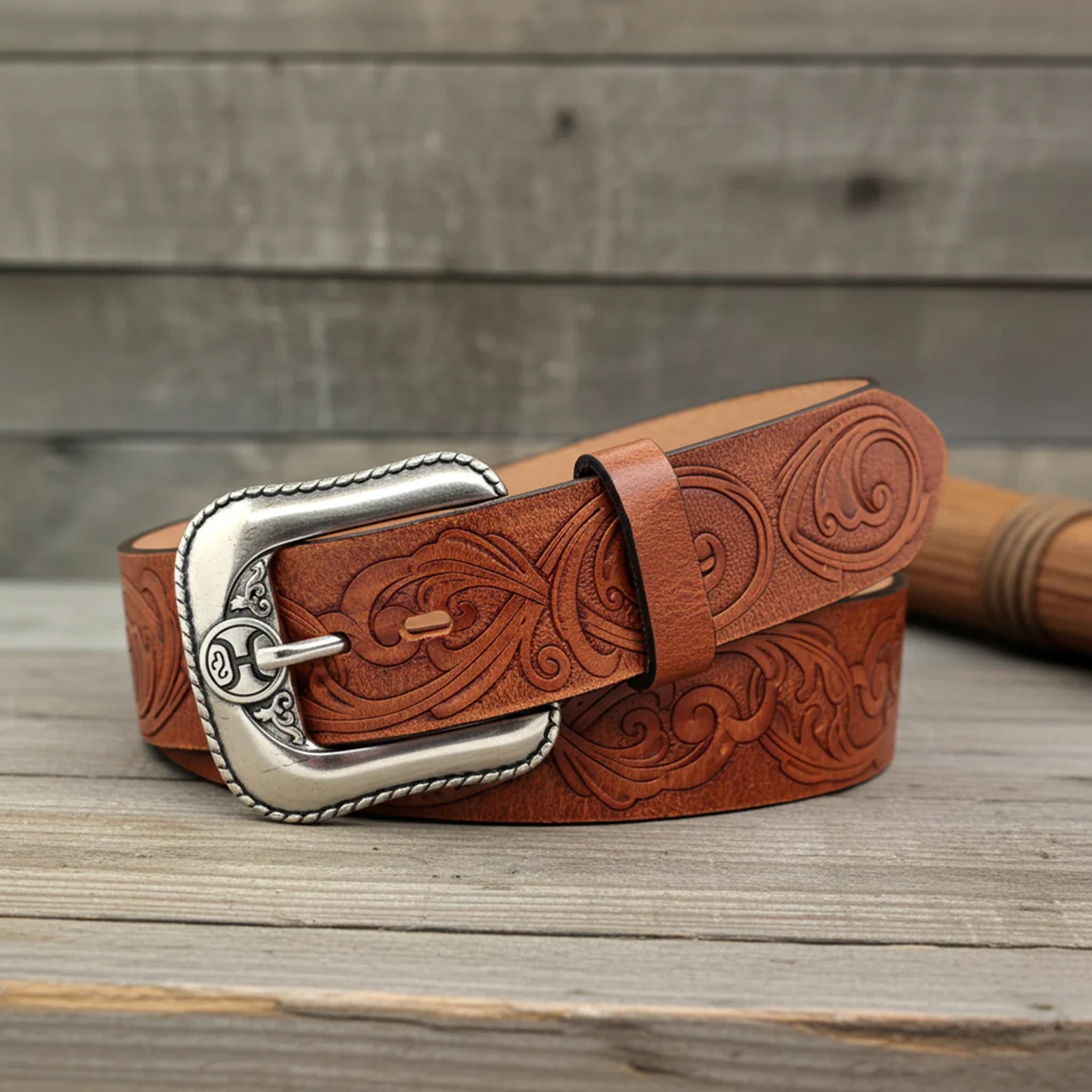 The rich brown leather showcases an intricate Monterey embossed pattern that catches the light just right, giving your outfit that authentic ranch-ready edge. Whether you're heading to the rodeo or just want to bring some frontier spirit to your wardrobe, this belt delivers genuine character without taking itself too seriously.