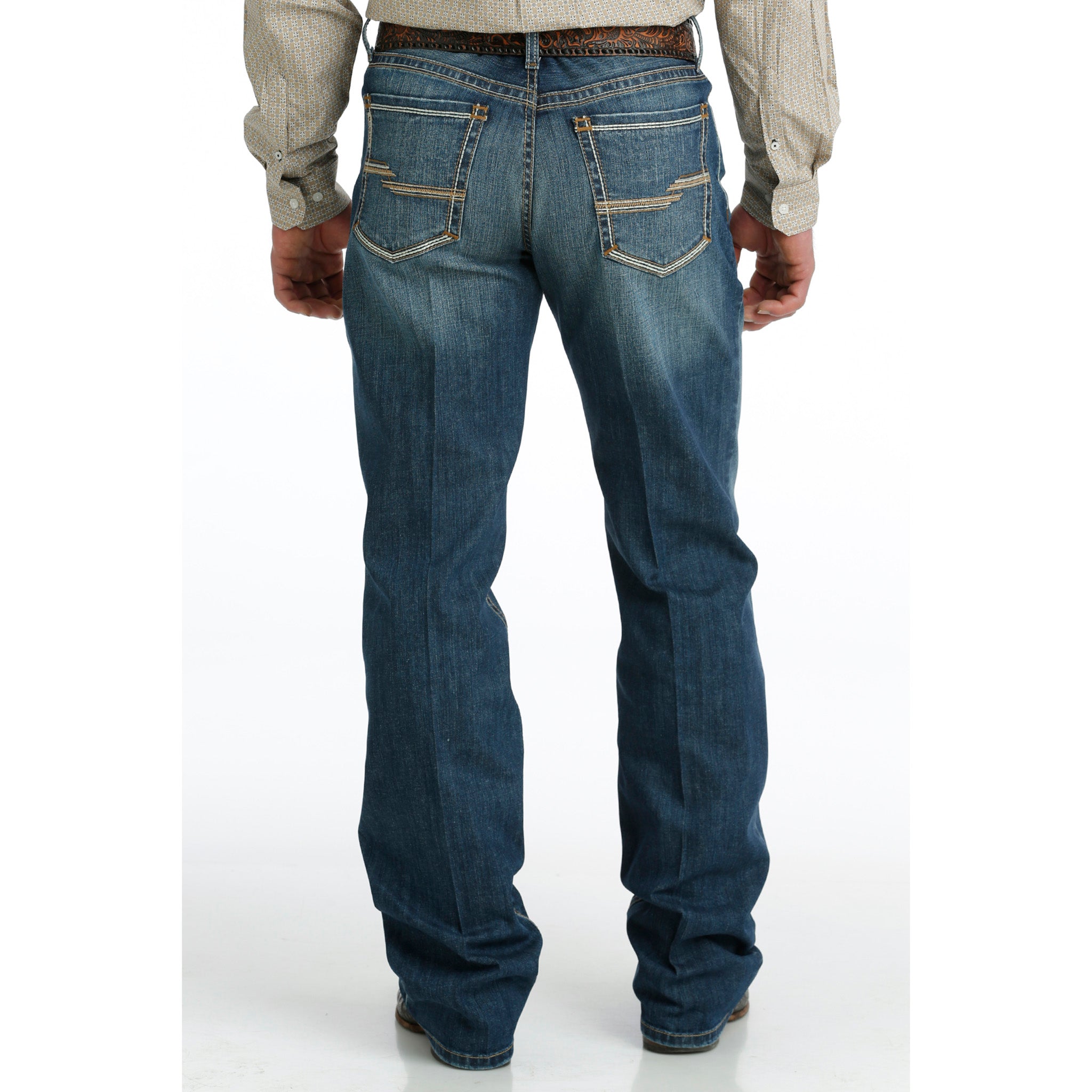 Stay stylish and comfortable in these classic relaxed fit Grant style jeans from Cinch! A warm blend of brown and khaki embroidery, with a popular dark stonewash finish. Accented with chevrons, grinding, sanding, and whiskers.