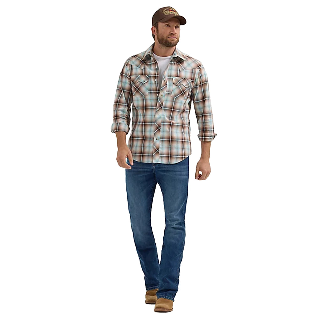 Honoring our Western heritage, this men's Wrangler Retro® long-sleeve western shirt blends timeless style with contemporary appeal. You'll appreciate the authentic details—spread collar, pointed yokes, and dual embroidered sawtooth snap flap pockets that bring a striking accent to your wardrobe. The modern silhouette and cotton construction ensure exceptional comfort and durability through countless wears. For a complete Western-inspired ensemble, pair with Wrangler Retro bootcut jeans, creating a versatile look suitable for any event.